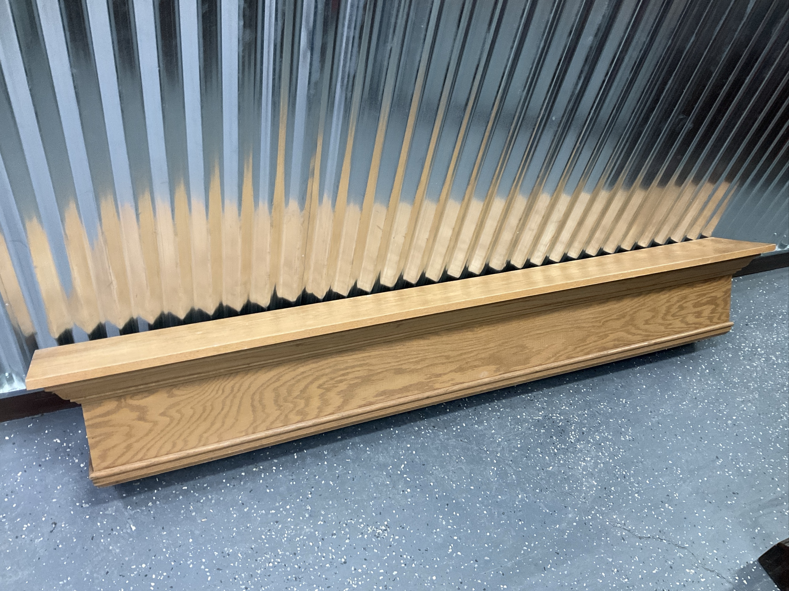 Wooden wall shelf with decorative edging. This shelf is ready to be hung on a wall to hold your decorations or other items. 12 x 81 x 9.5 in.
