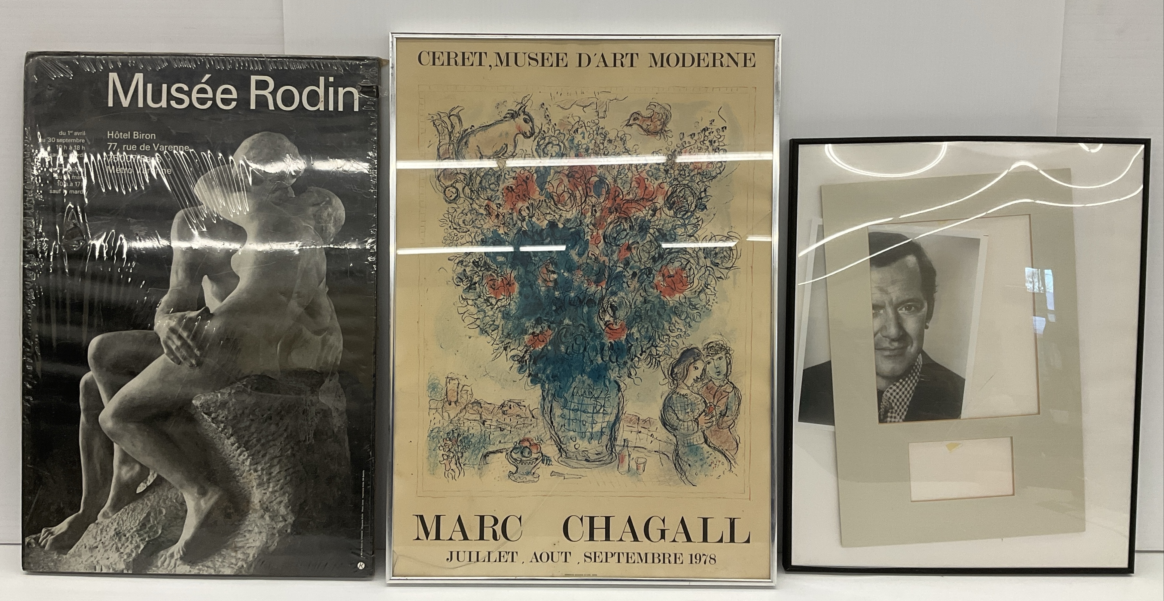 Includes a sealed Rodin Museum exhibition poster, a framed Marc Chagall print, and a framed black and white portrait. See photos for damage. Largest 25.25 x 18 in.