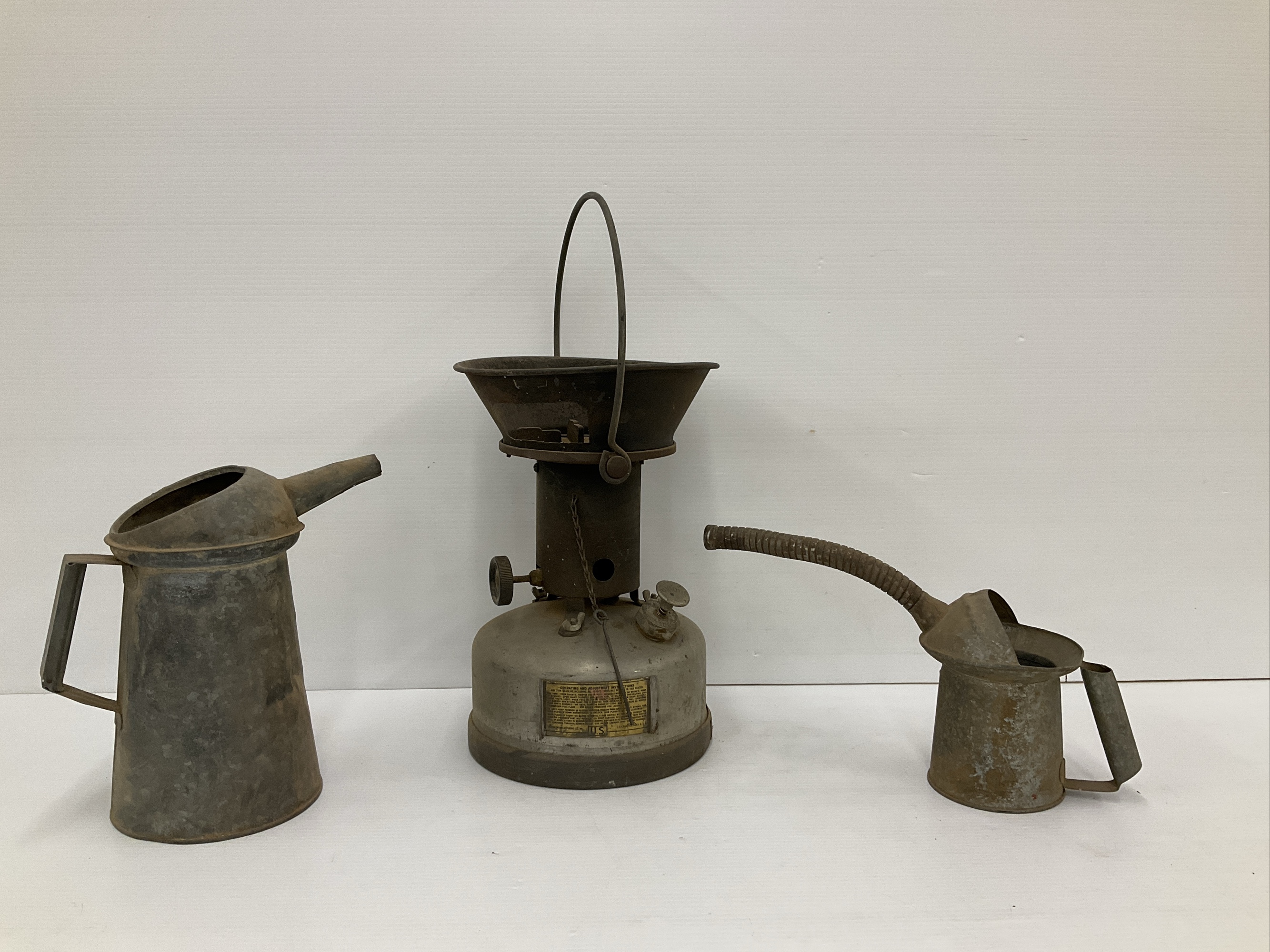 Includes a metal gas heater, oil cans with handles and pouring spouts. Largest 22 x 9.5 in.