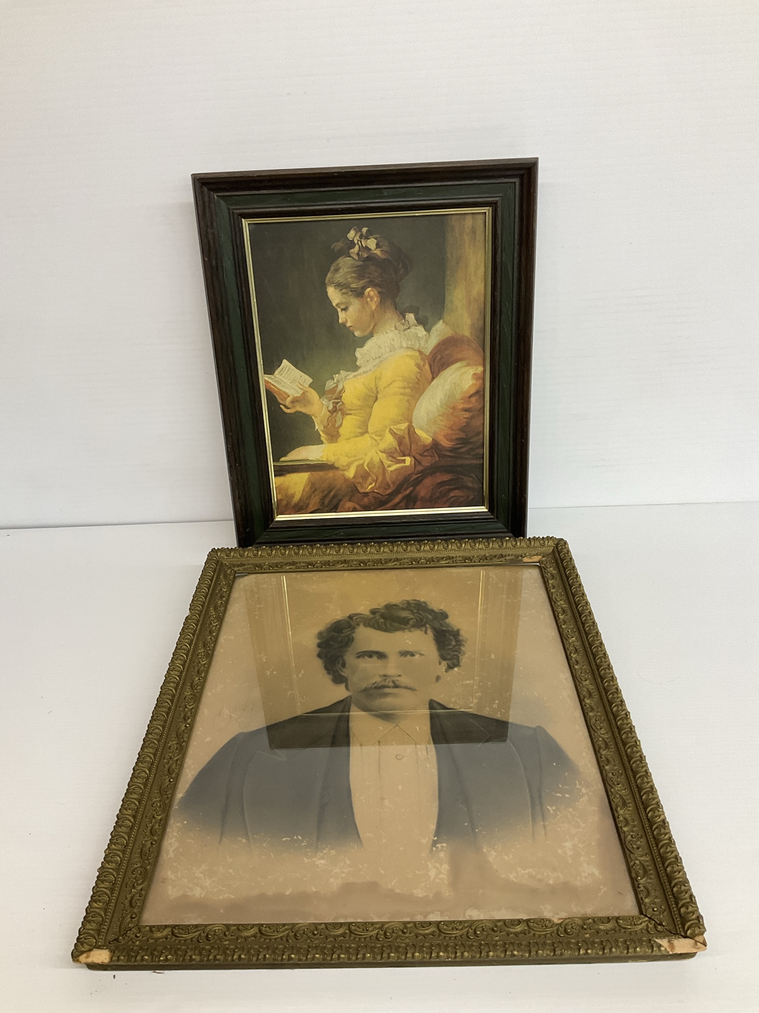 One features a woman in a yellow dress reading a book. The other is a portrait of a gentleman with a mustache. Both are framed and ready to display. Largest 23 x 19 in.