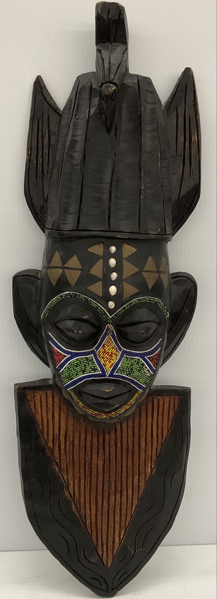 Intricately hand carved mask featuring a tribal-inspired design. The mask showcases detailed beadwork and geometric patterns. The top has a distinctive bird figure. 30 x 9.5 in.