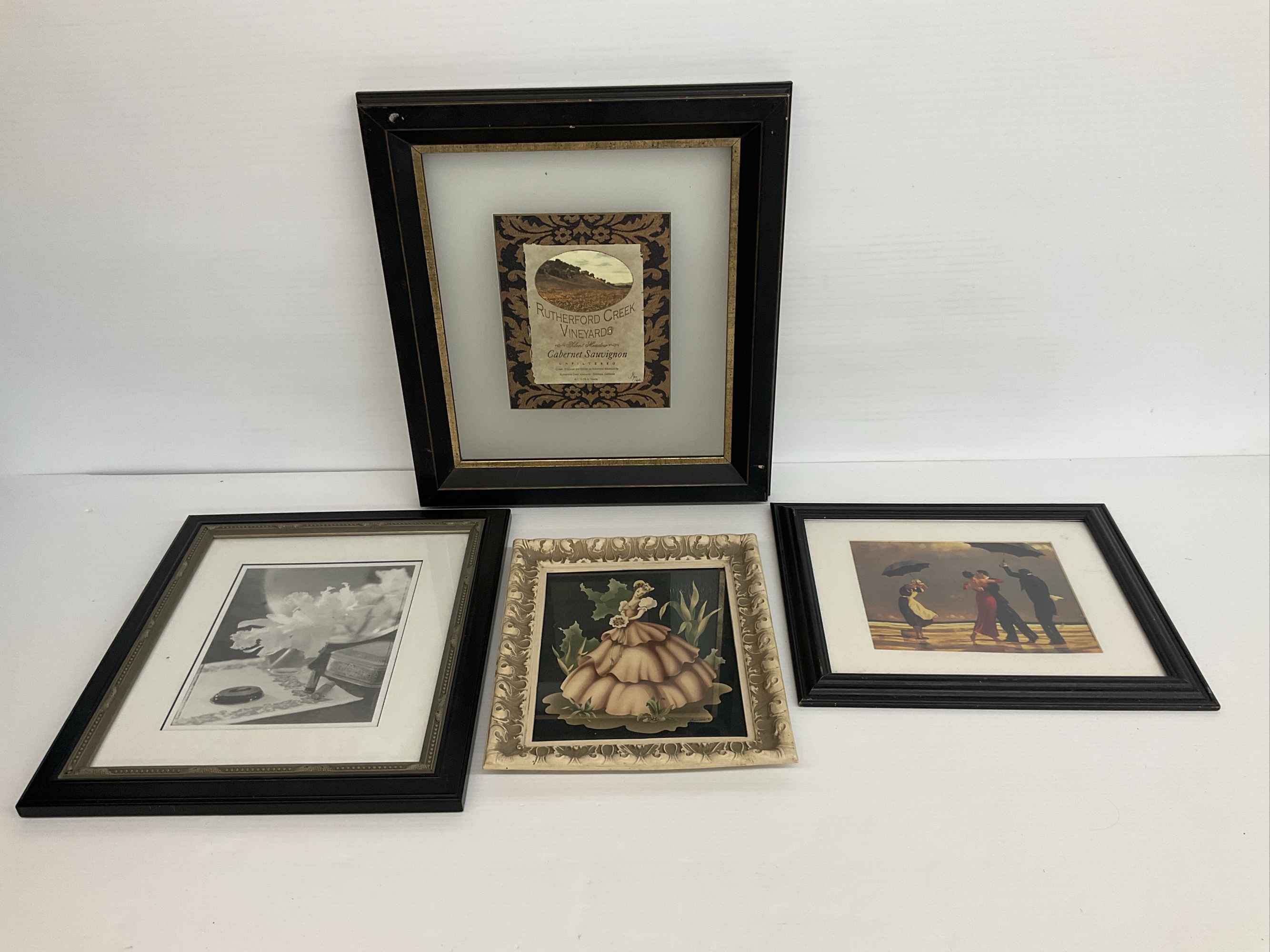 This set includes four framed prints. One features a wine label, two are of people in different settings, and the last piece depicts a dress in neutral colors. All come in frames ready to hang.