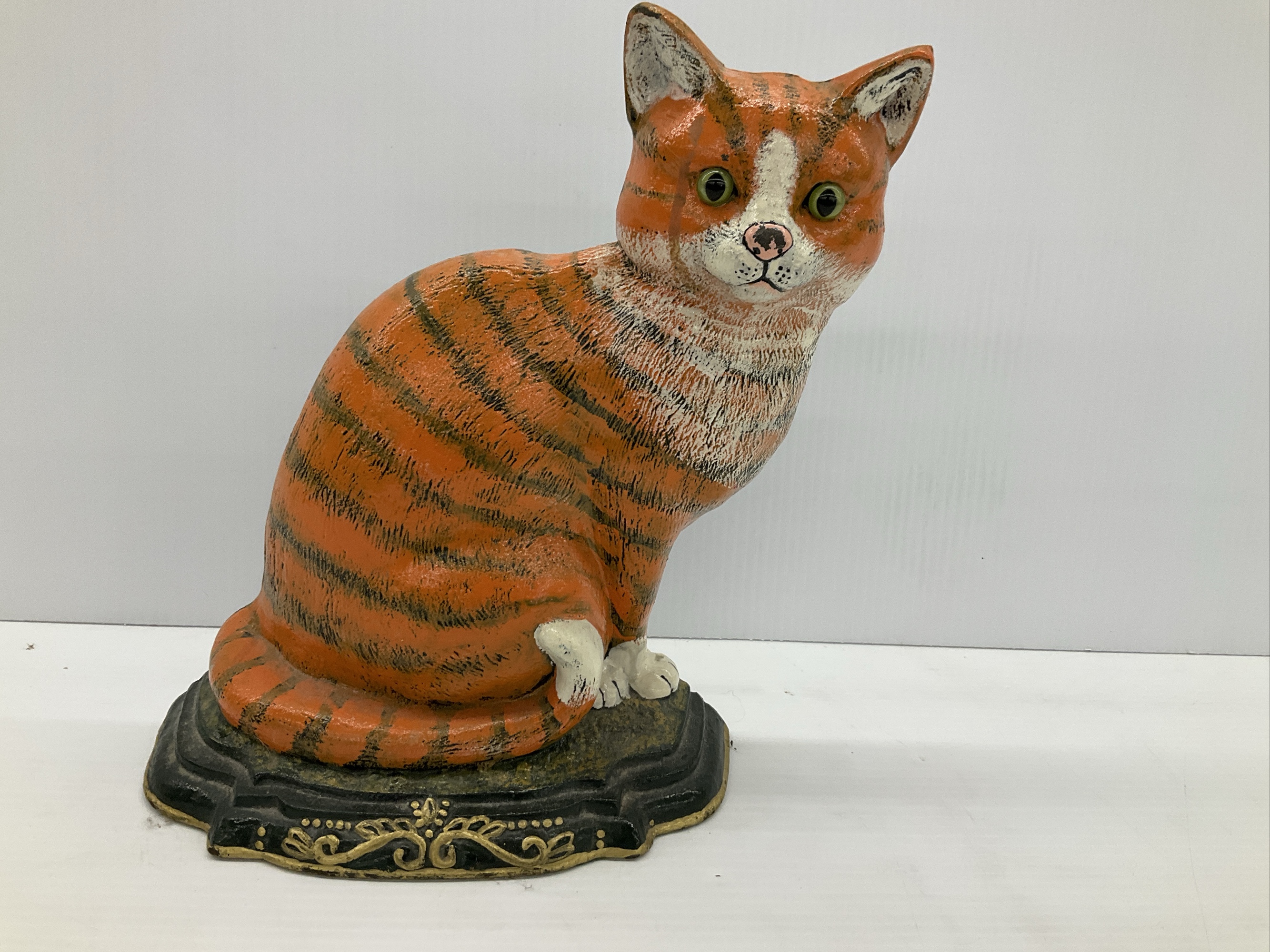 Cast iron figurine of an orange tabby cat, seated on a black and gold base. 12 in. tall.