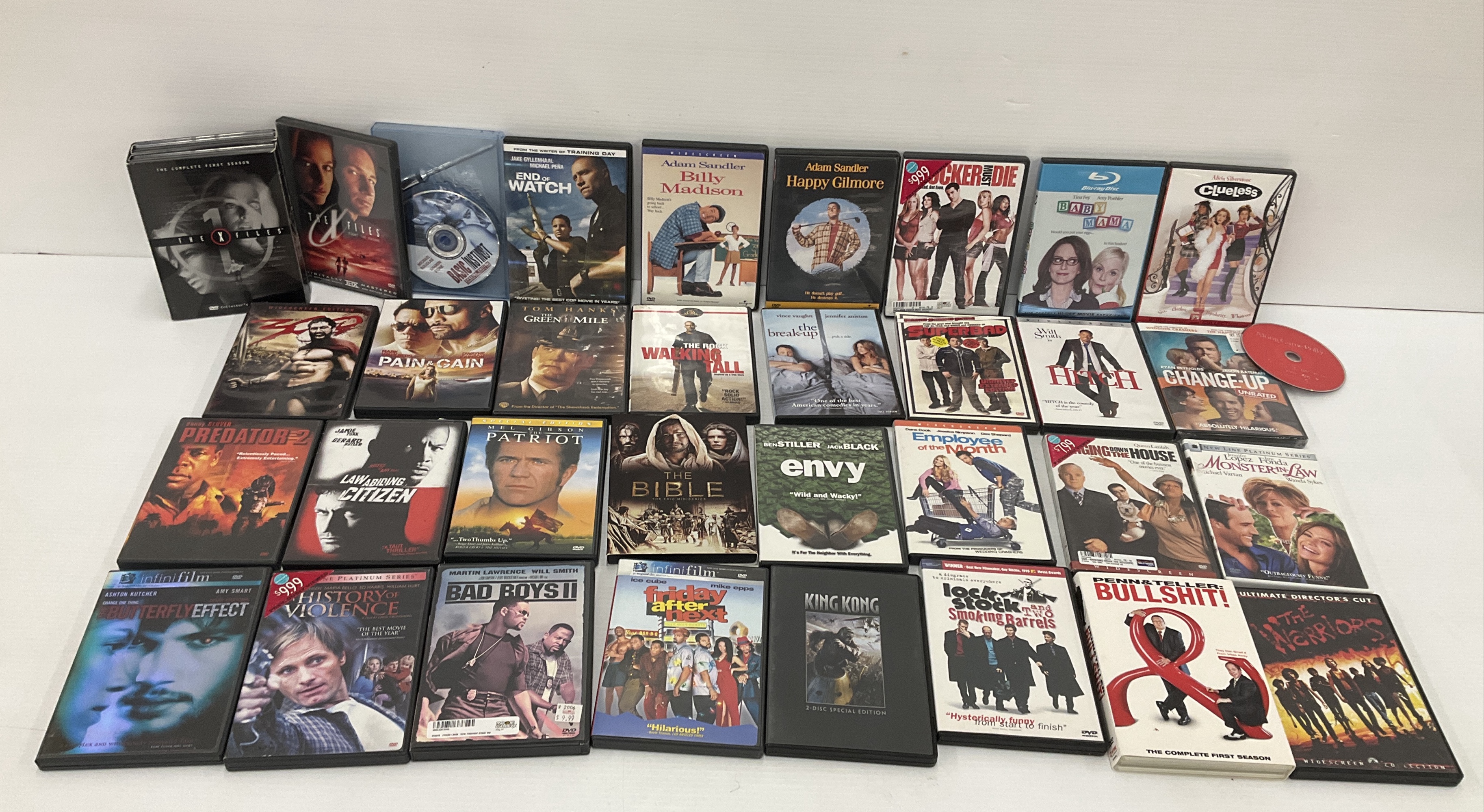 This lot features a variety of DVDs, including popular titles like The X-Files (Season 1), Adam Sandler comedies, action movies, dramas, and more. A great collection for movie enthusiasts.