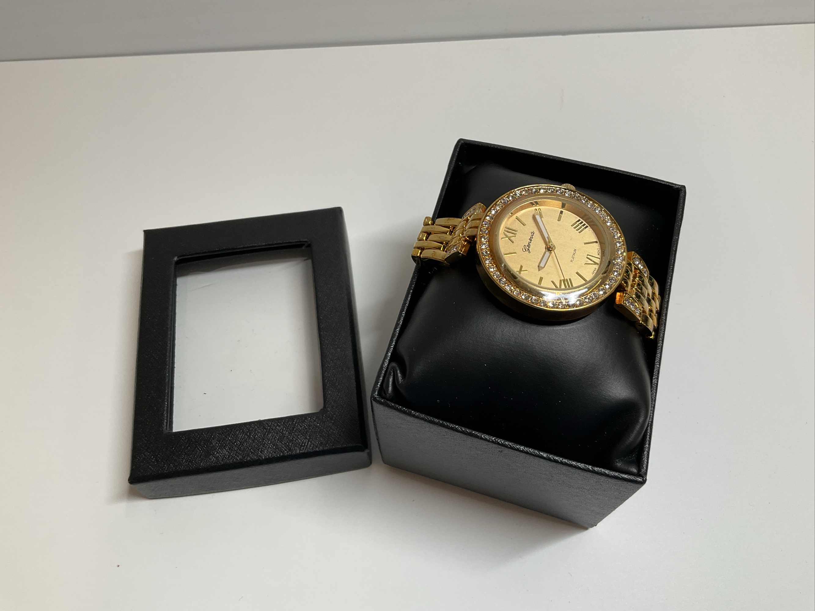 Gold tone ladies' wrist watch by Geneva Platinum. Round face with rhinestones around the outer rim and on the band. Comes in original box. We do not guarantee watches to work.