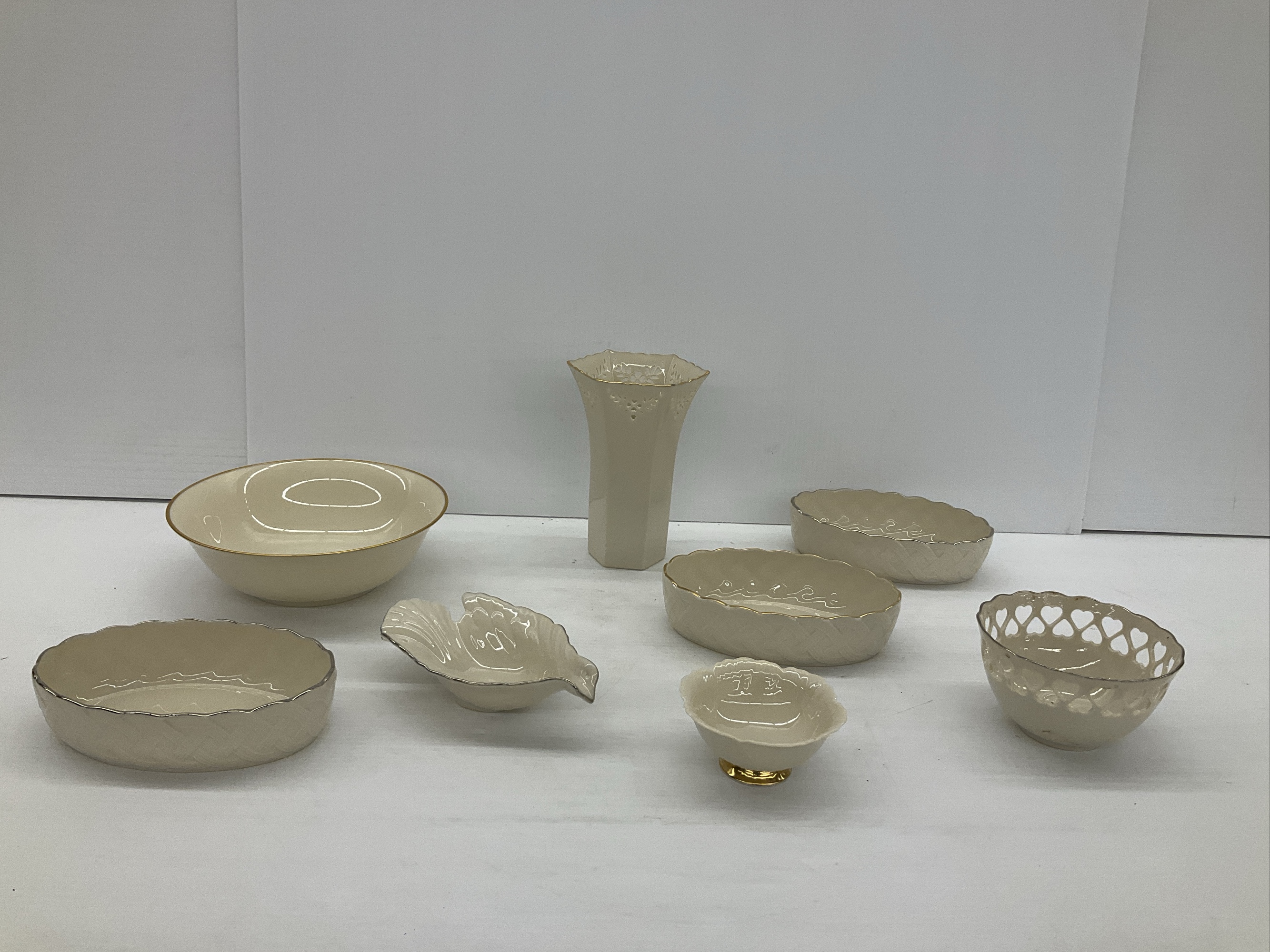 Collection of Lenox bowls, dishes and a vase 8 in. tall. This lot features a variety of sizes and shapes with elegant accents. Includes pieces from the 'Special' and 'Mansfield' lines. Made in the USA.
