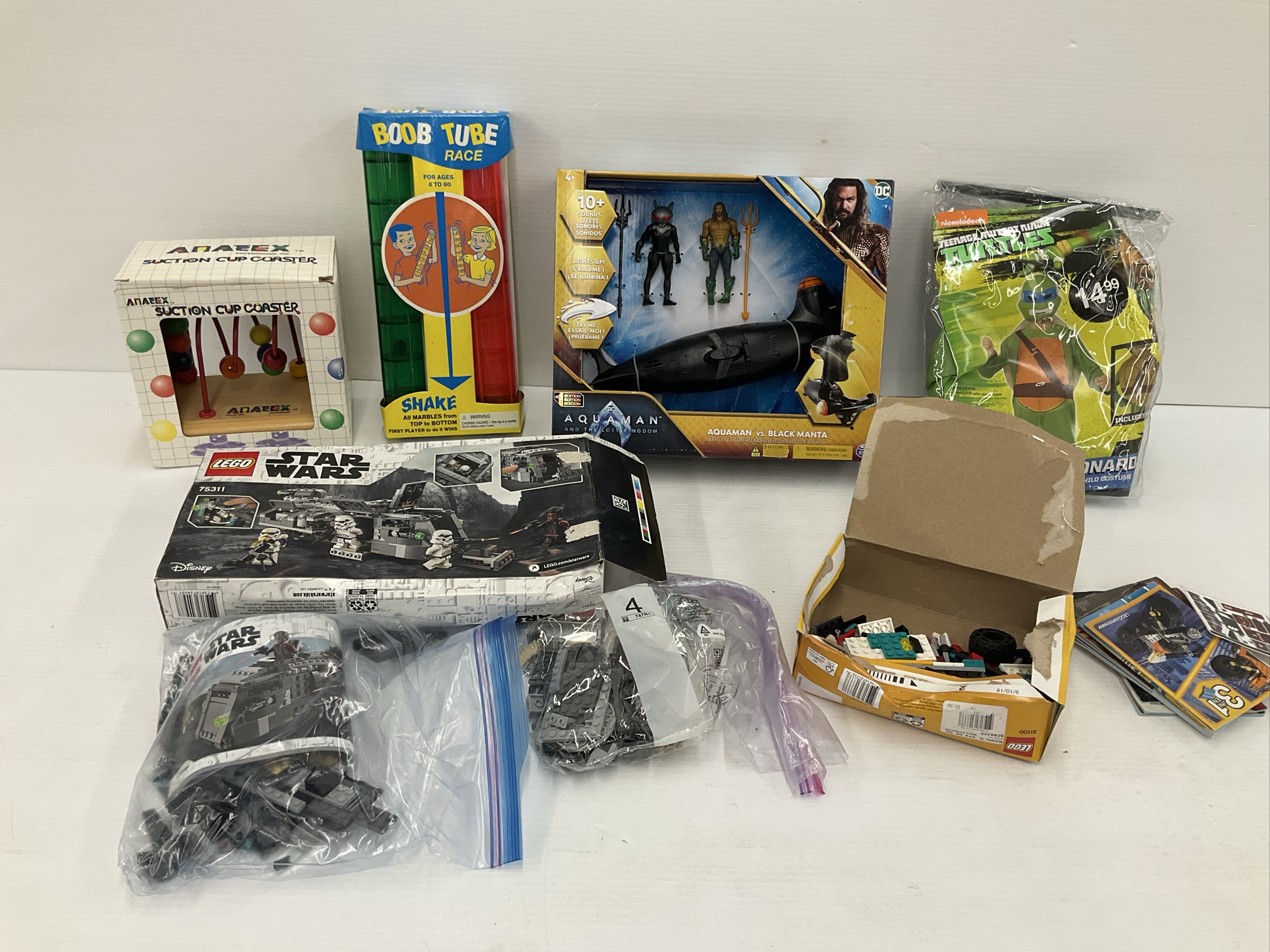 Collection of assorted items including a Lego Star Wars Armored Marauder 75311 set, Lego Creator 31100 set, Aquaman and Black Manta figures with submarine, a Teenage Mutant Ninja Turtles Leonardo costume size Small(4-6), Suction Cup Coaster, and a Boob Tube Race toy game.
