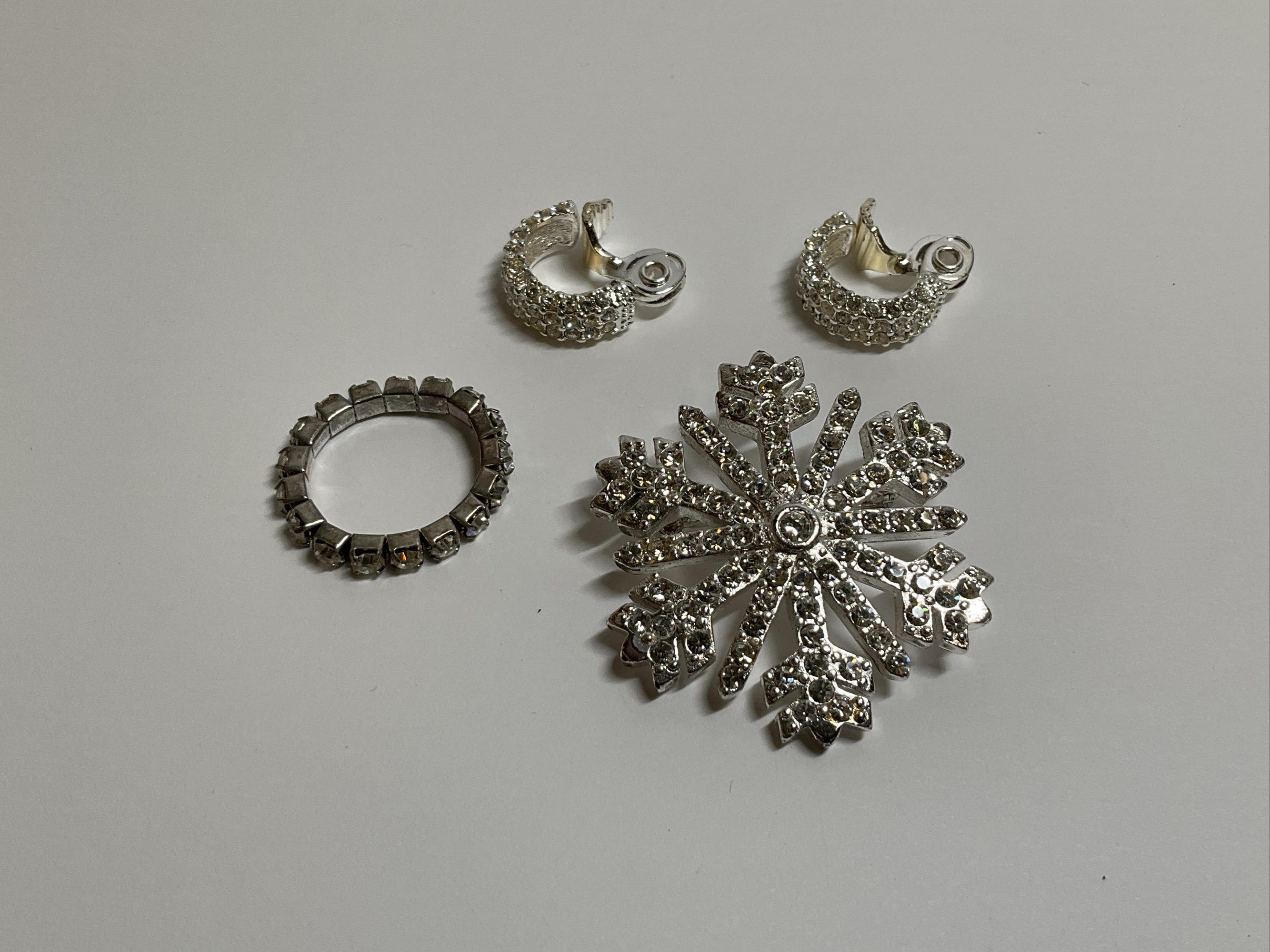 This jewelry grouping includes a snowflake shaped brooch, a ring and a pair of earrings.
