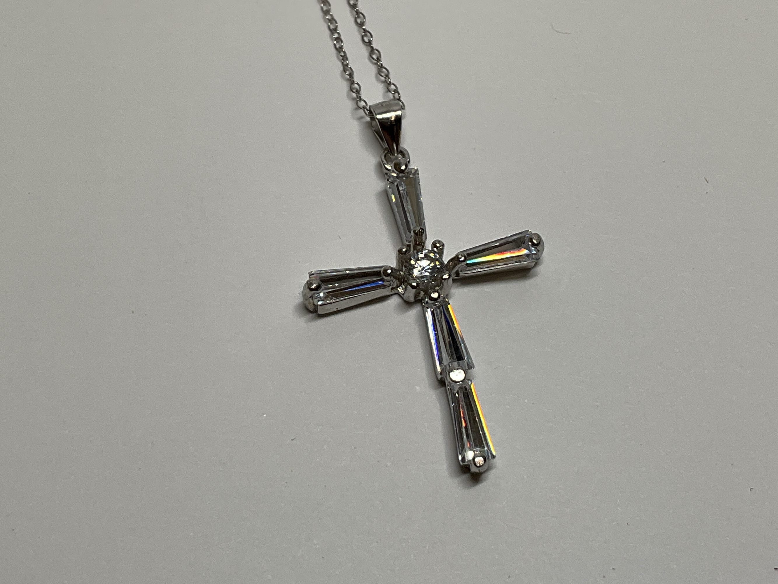 Rhodium plated sterling silver cross pendant necklace with simulated diamonds. Includes chain and presentation box.