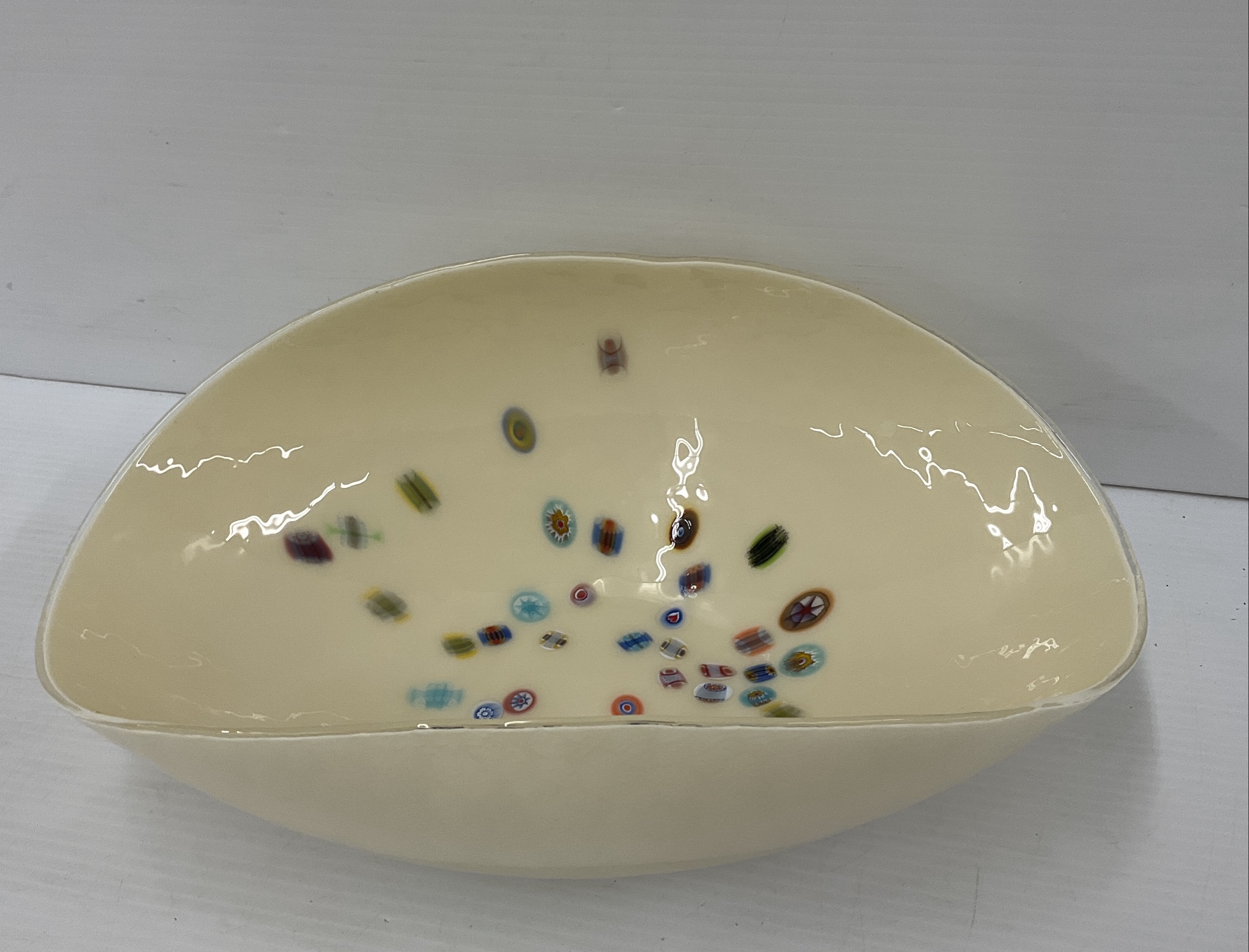 This is a decorative art glass bowl with an irregular form. It features a creamy white base and is decorated with scattered murrine (small decorative glass pieces) in various colors and patterns. Measures 5.5 x 16 x 9.5 in.