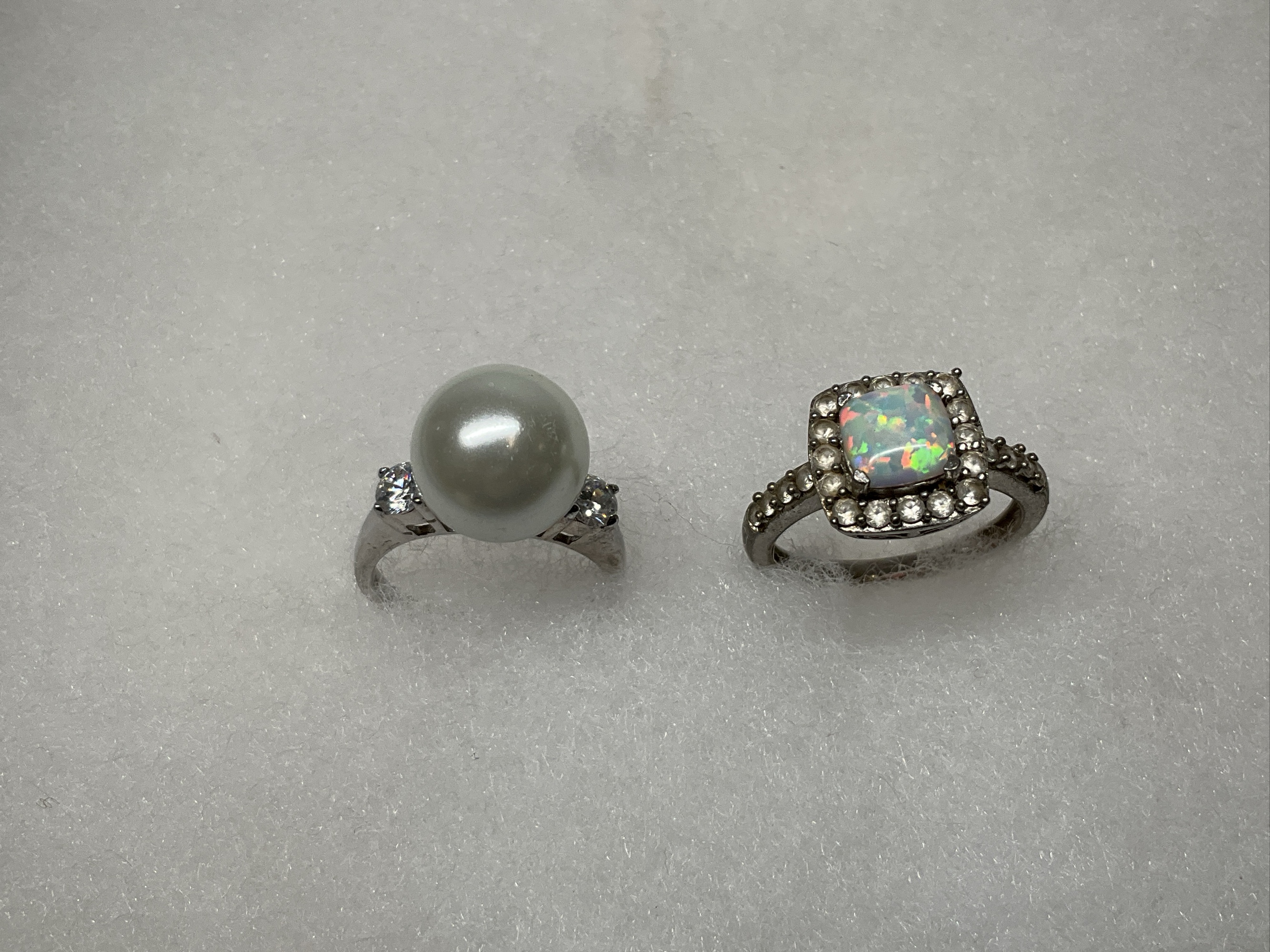 This lot features two sterling silver rings. One ring has a large, round, pearl-like center stone. The other has a square stone with an opal and a decorative halo of smaller clear stones. Both size 7.25.