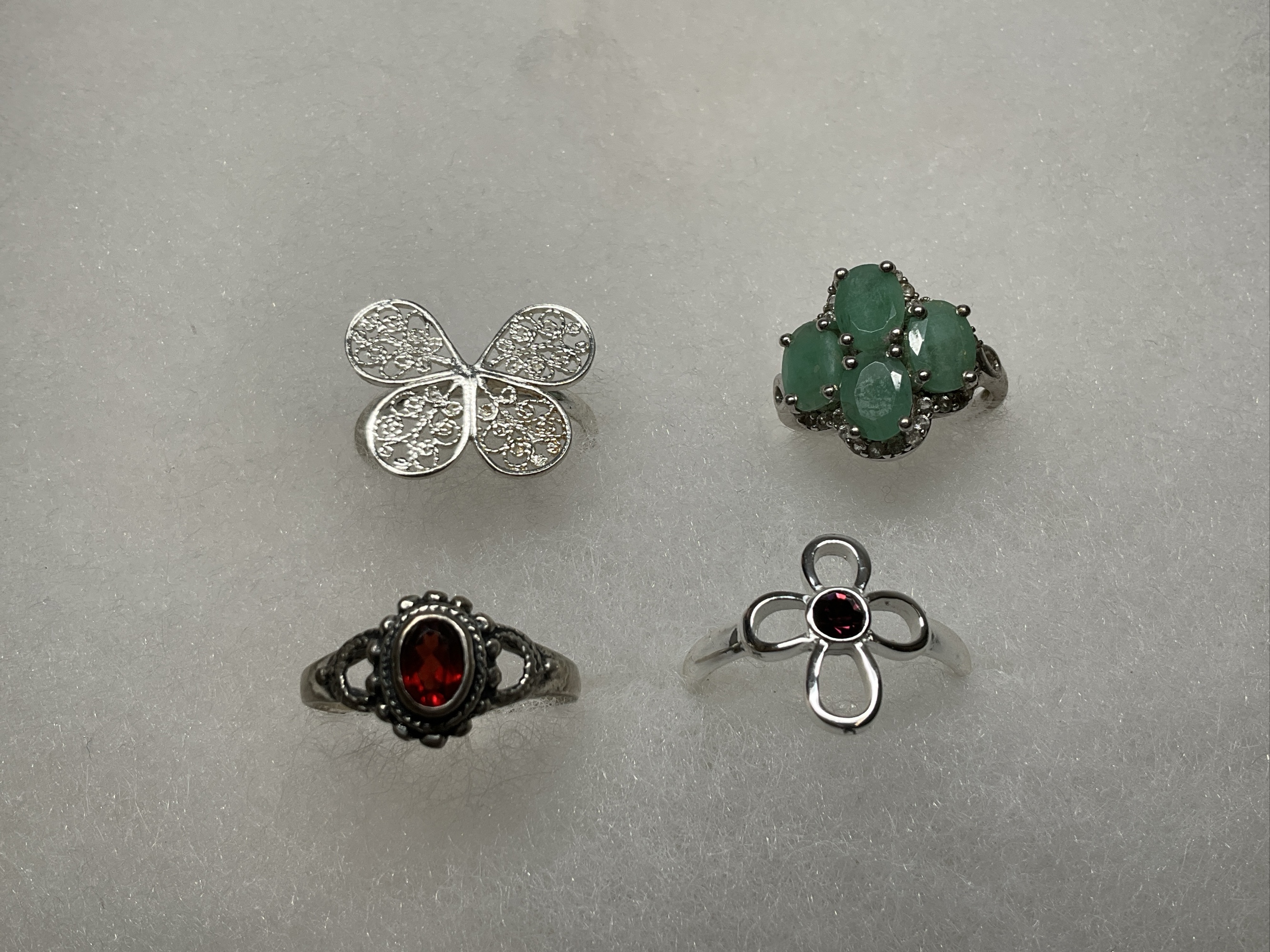 Styles include butterfly size 7.5, red gemstone size 8, green gemstone cluster size 5 and cross with gemstone size 9.