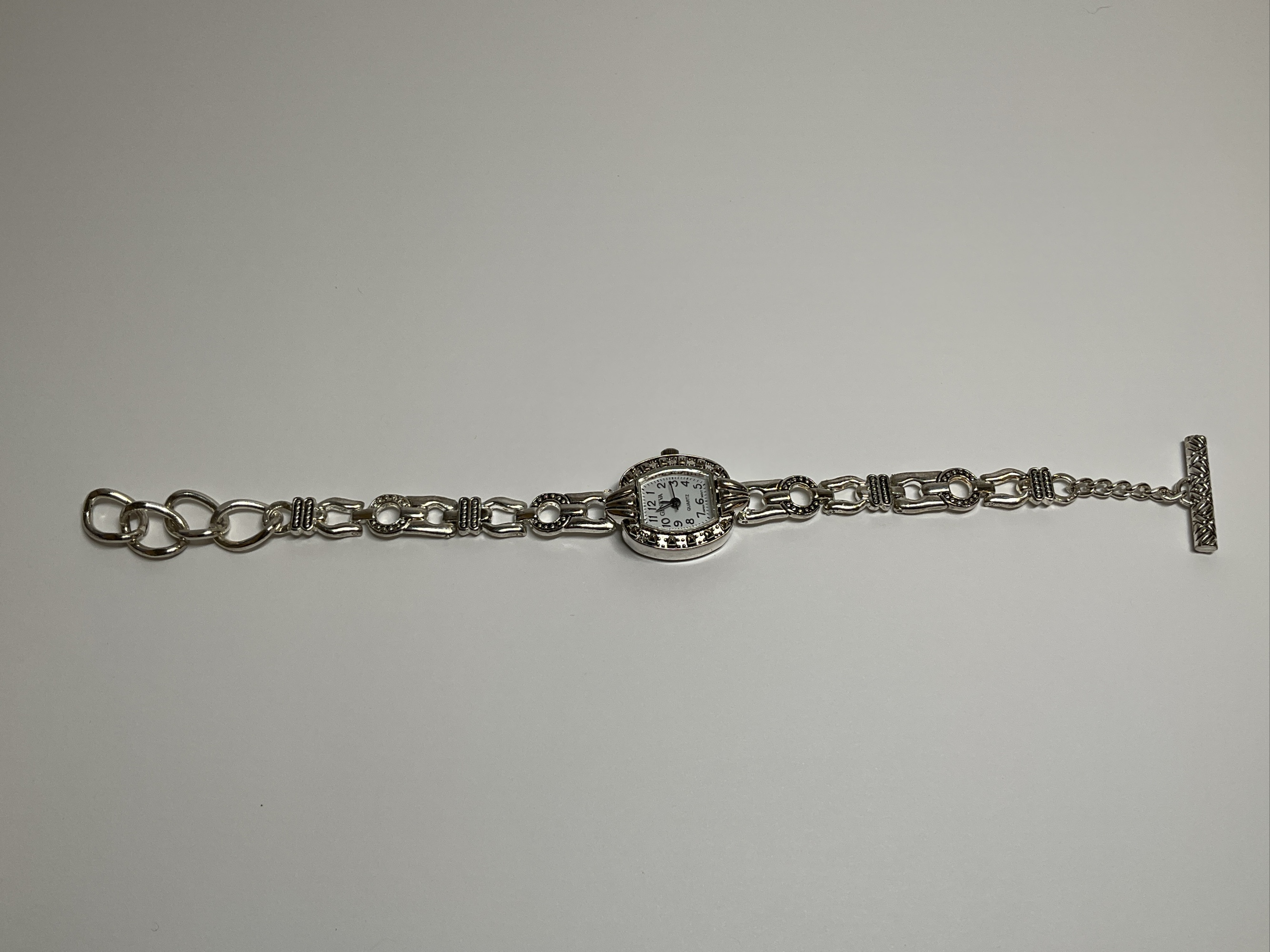 This listing is for a Geneva Quartz wrist watch. The watch features a silver-tone band with decorative accents, a stainless steel back, and a metal base bezel. The watch is quartz, ensuring accurate timekeeping. We do not guarantee watches to run.