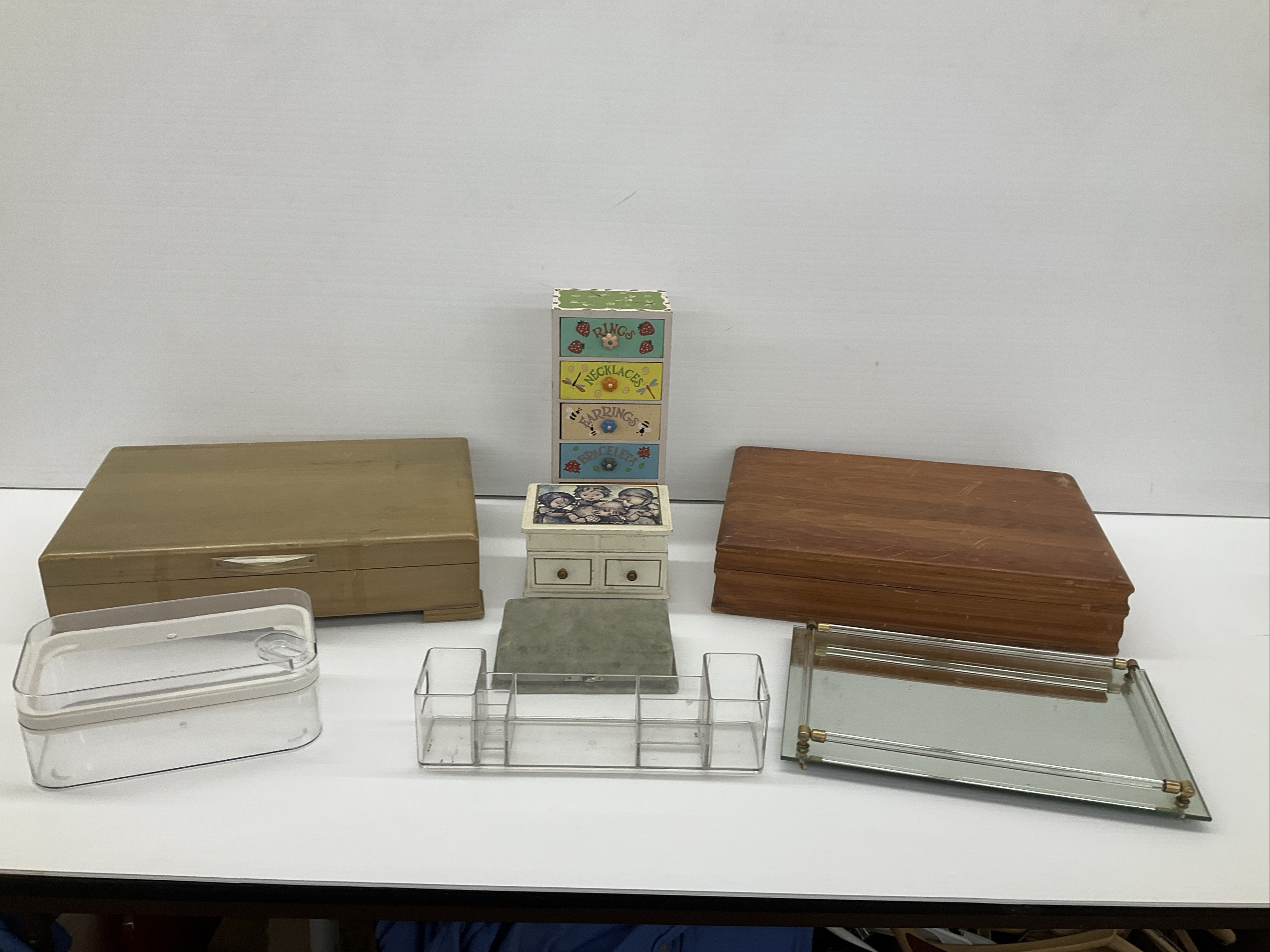 This lot includes a variety of decorative boxes and organizers. It contains wooden boxes, a divided clear organizer, small chests, and a mirrored tray. Great for storage or display.