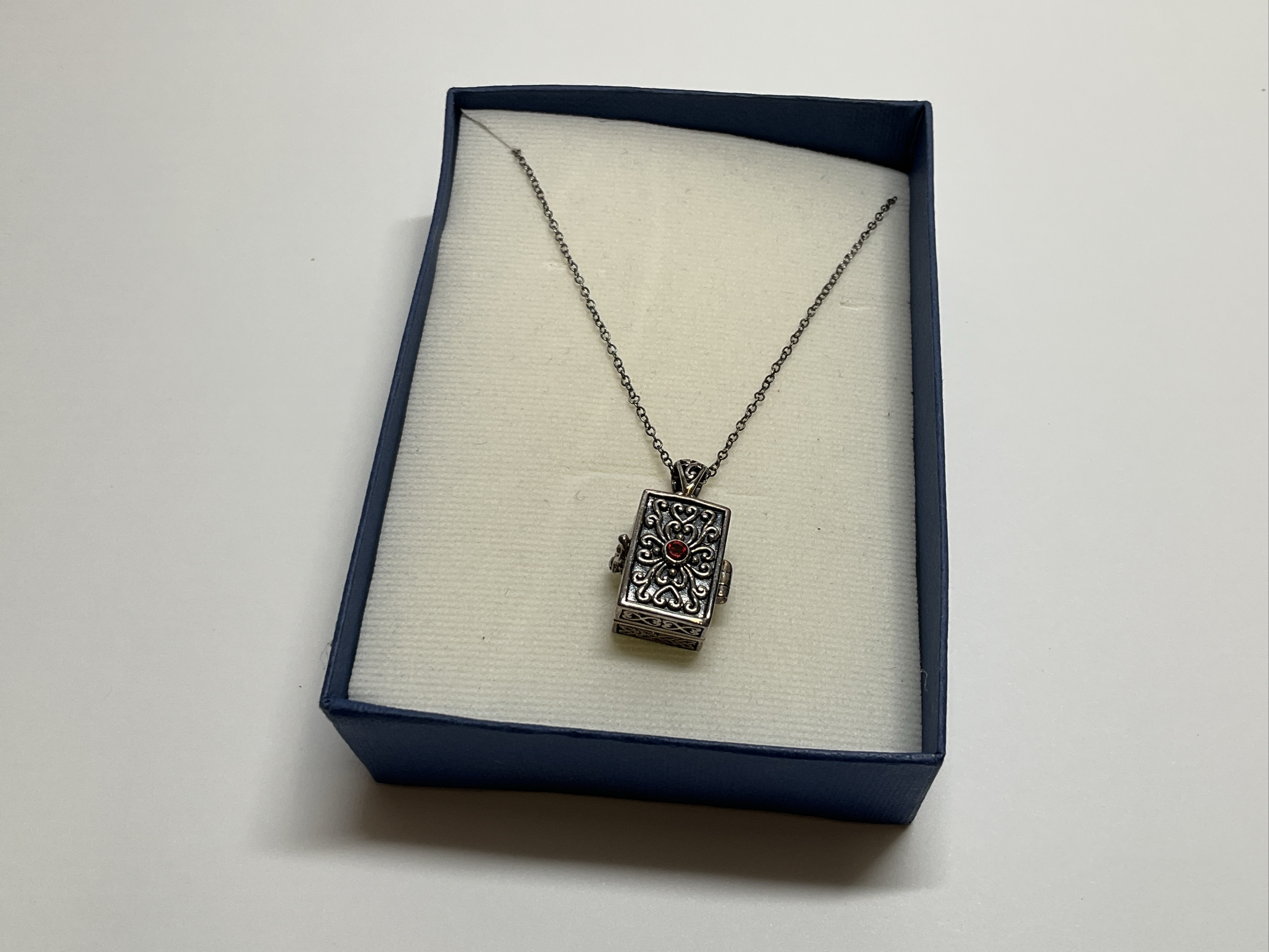 This is a lovely 925 sterling silver prayer box pendant necklace made in Thailand. The locket is ornately decorated and has a red garnet stone accent.