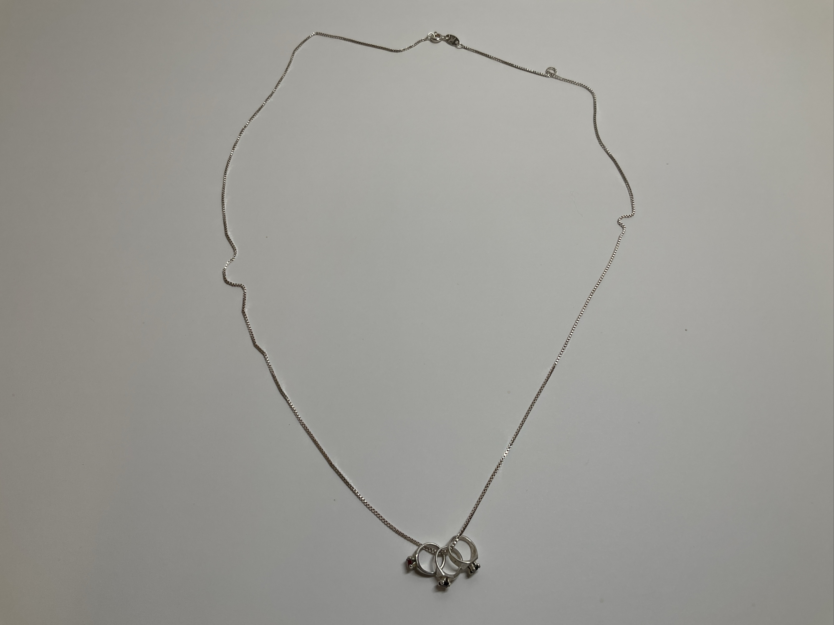This listing features a sterling silver box chain necklace with a lobster claw clasp. The necklace is adorned with three rings as pendants, each set with a colored stone.