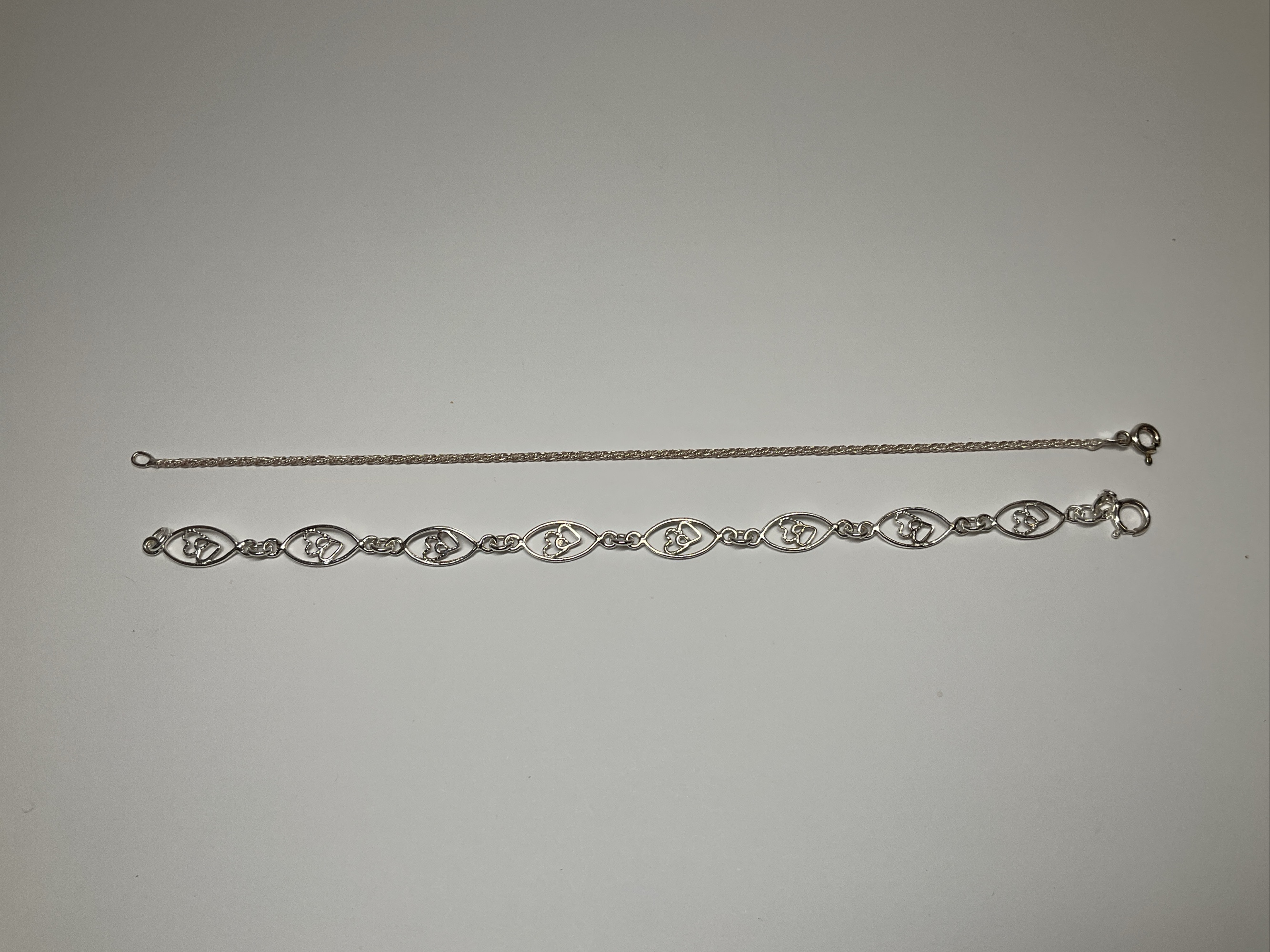 This lot includes two sterling silver bracelets. One bracelet has an eye-shaped link design, and the other is a chain design. Total weight is approximately 0.205 troy ounces.