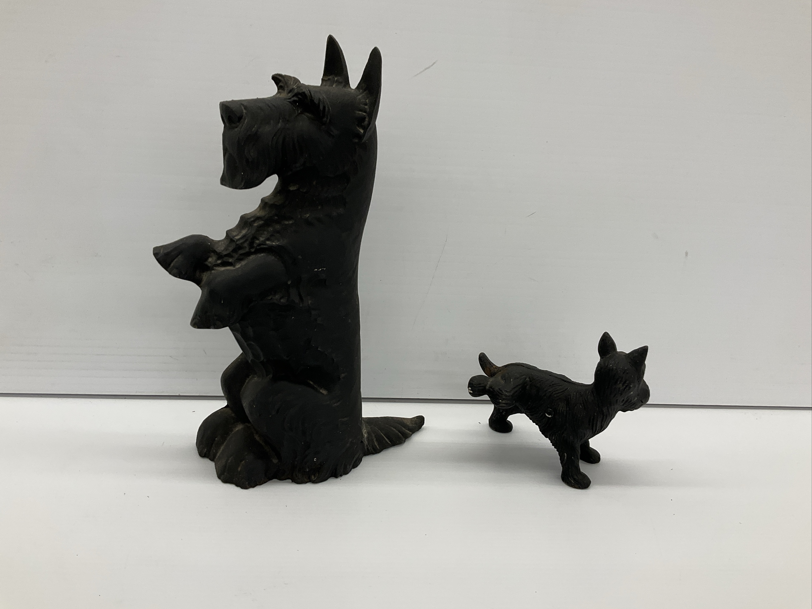 This lot includes a pair of cast iron figures featuring Scottish Terriers. One figure stands upright, resting on its hind legs, while the smaller figure is in a standing position with a back leg lifted. The larger figure is 16 in. tall.