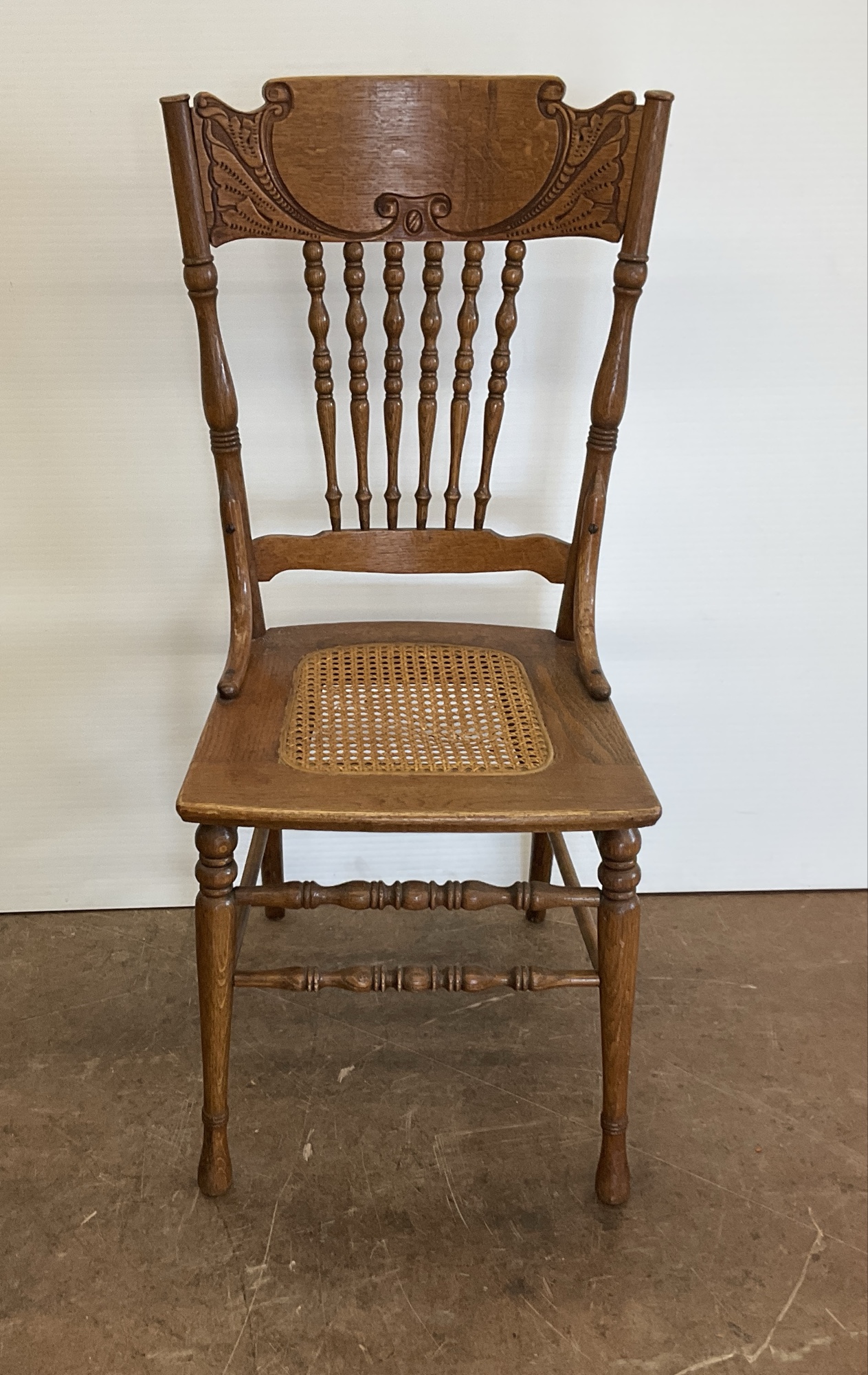 This is a wooden chair with a carved back, hip rails and a woven cane seat. 39 x 19 x 19 in.