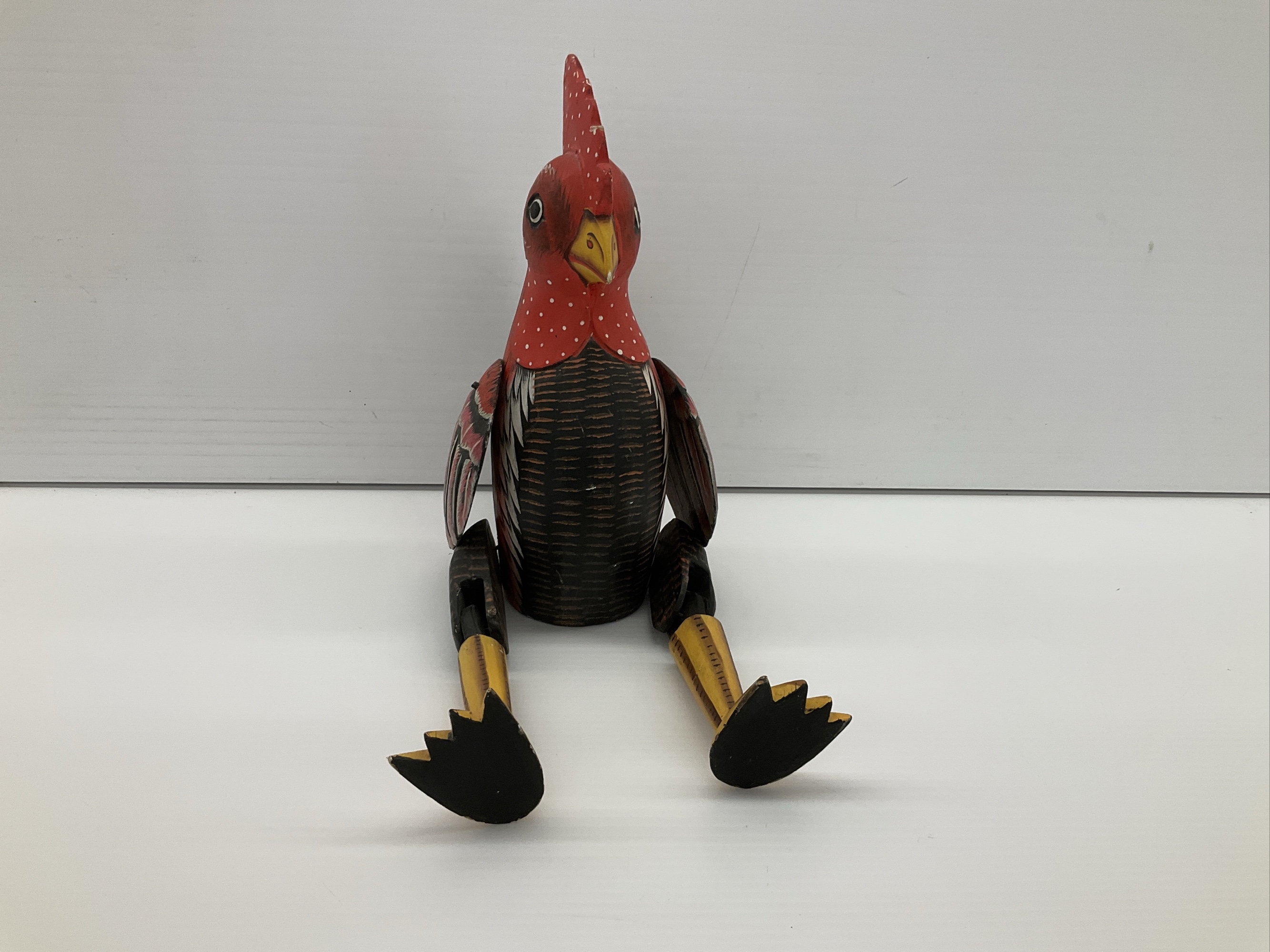 Colorful hand carved wood folk art piece, showing a rooster with jointed legs. 20 in. tall.