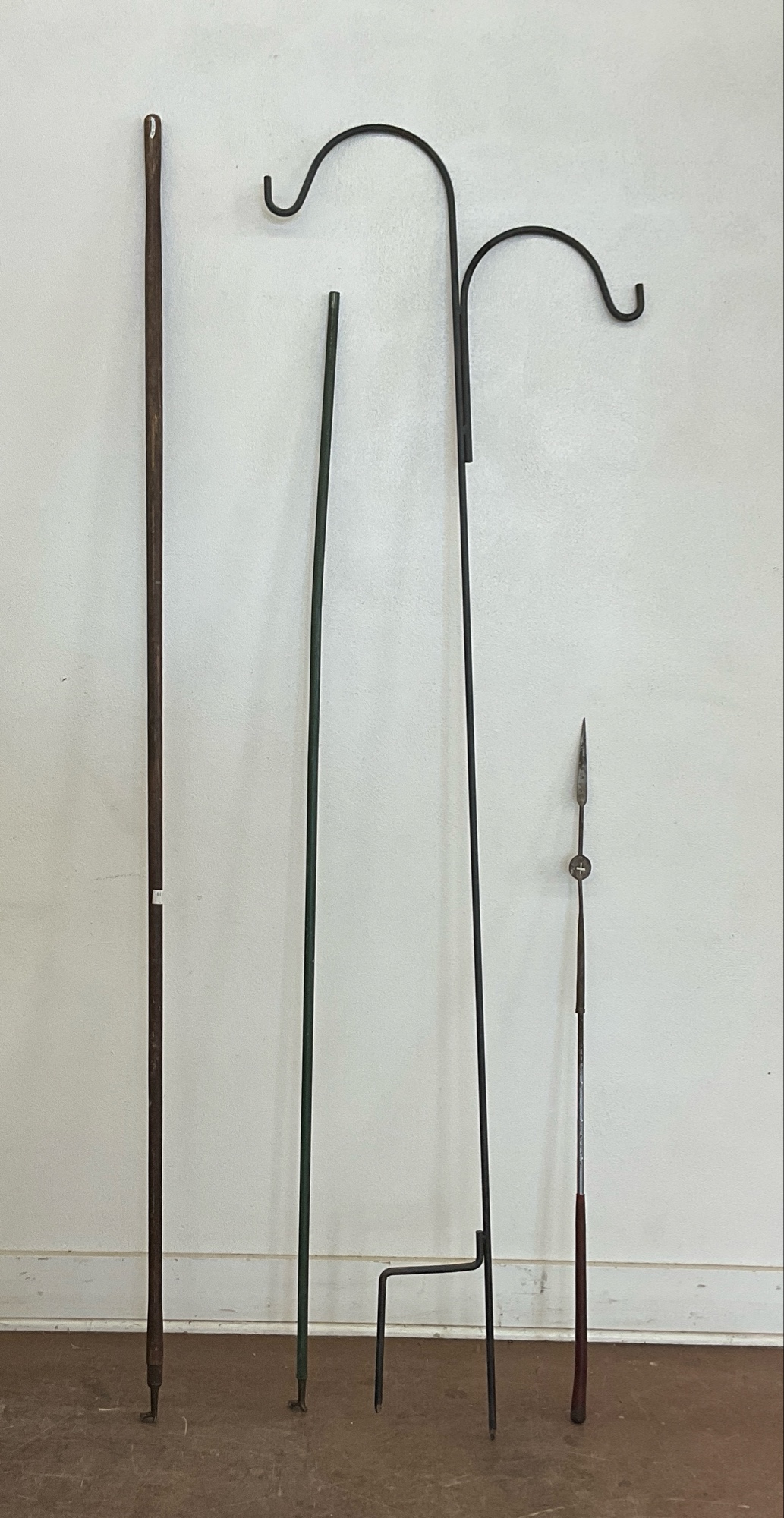 Includes a metal plant hanger, a ceremonial spear and two wands with metal on ends. Tallest 84 in.