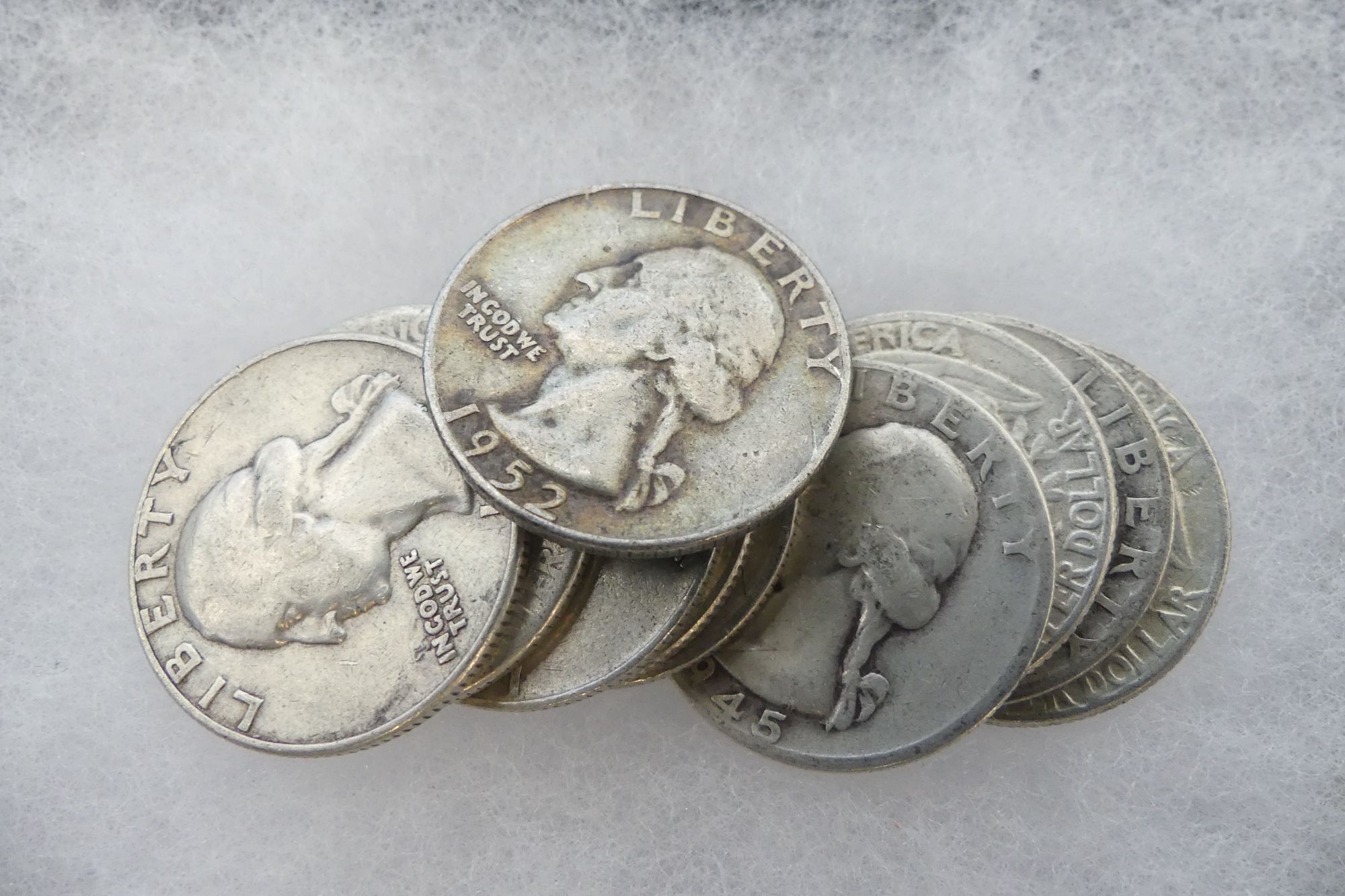 Collection of circulated silver quarters, including examples from 1945 and 1952.