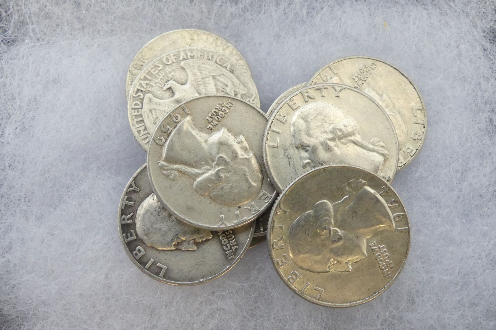 Collection of silver quarters, including examples from the 1950s and 1960s.