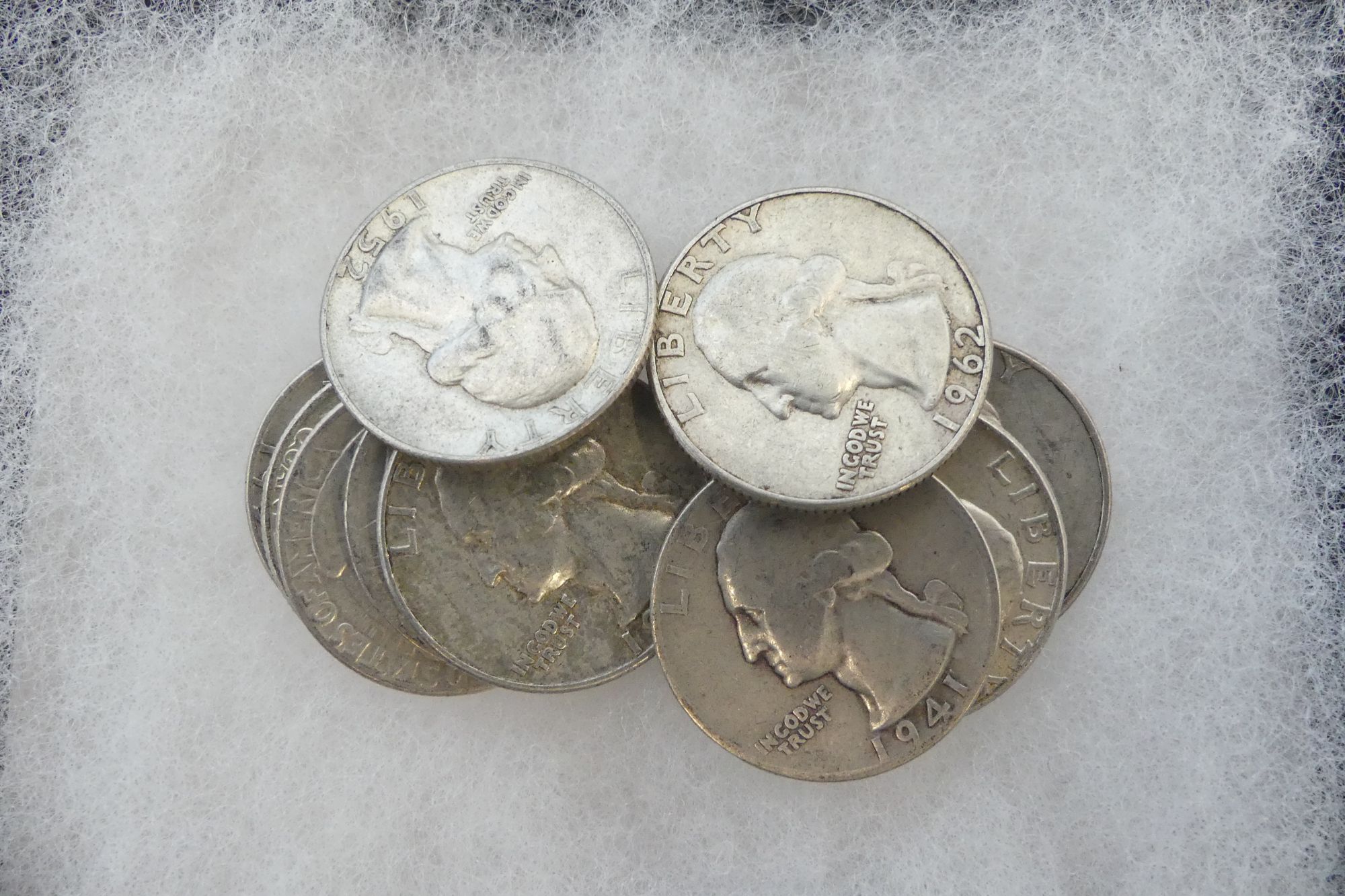 Collection of US Silver Quarters featuring dates 1941, 1952, and 1962.