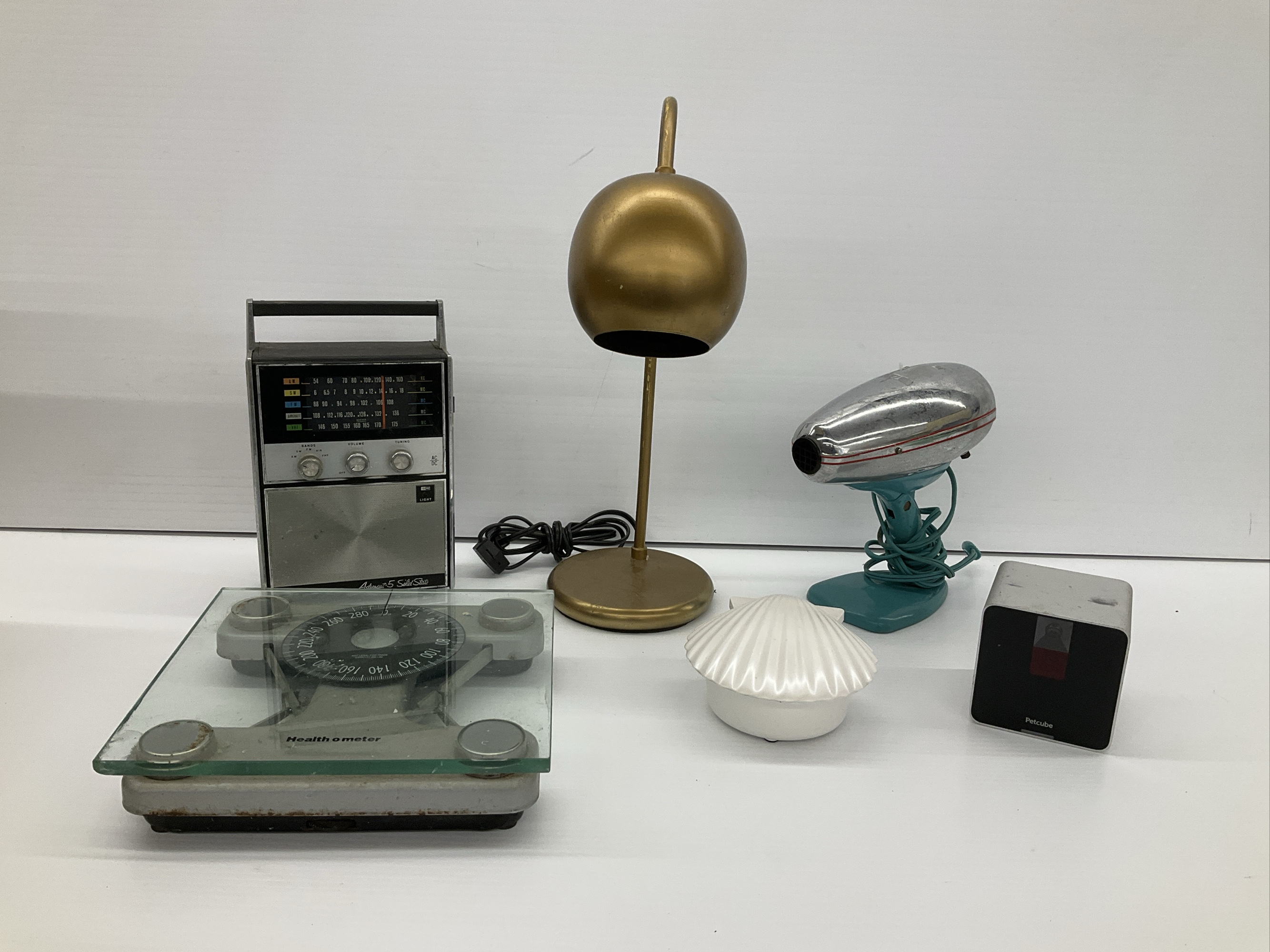 Group of home goods including a gold-colored lamp 18 in. tall, a Realistic radio, a Saxony hair dryer, a Healthometer scale, a sound machine, and more.