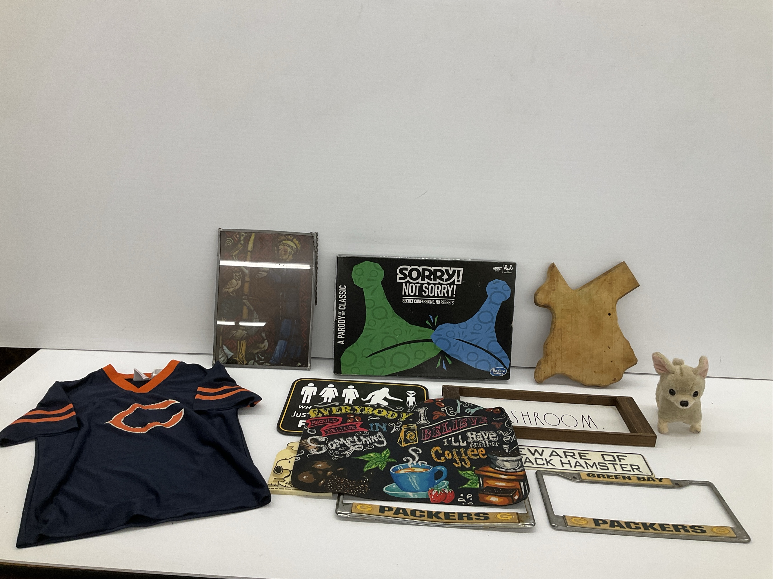 This collection includes a variety of items such as a Sorry! Not Sorry! board game, decorative wall art, a Chicago Bears jersey (size 6-7), and two Green Bay Packers license plate frames. Other items include a framed print, a coffee themed sign, a wooden cut out, a hamster warning sign and more.