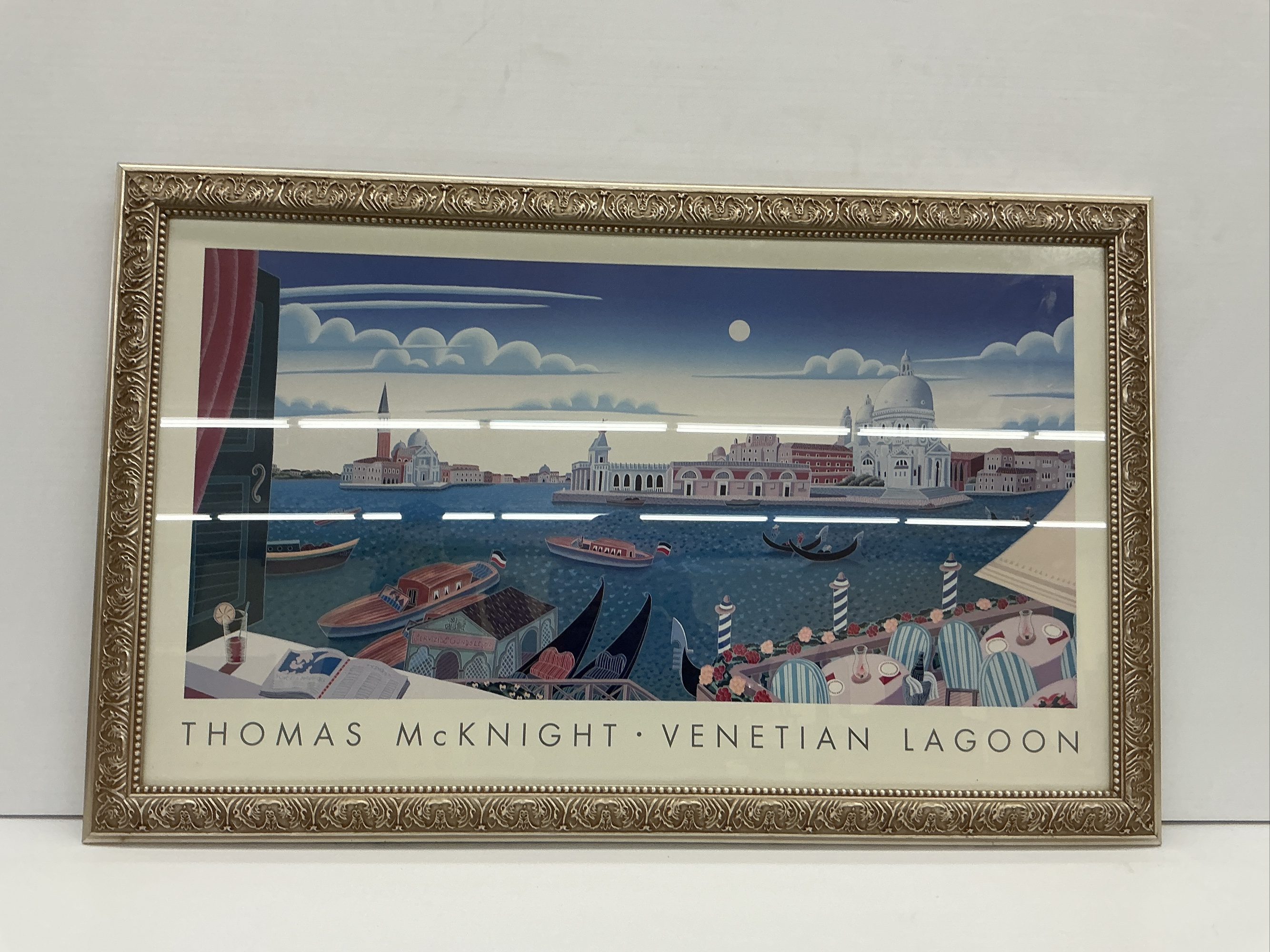 Framed print featuring a scene of the Venetian Lagoon by Thomas McKnight. Ready to hang. 27 x 43 in.