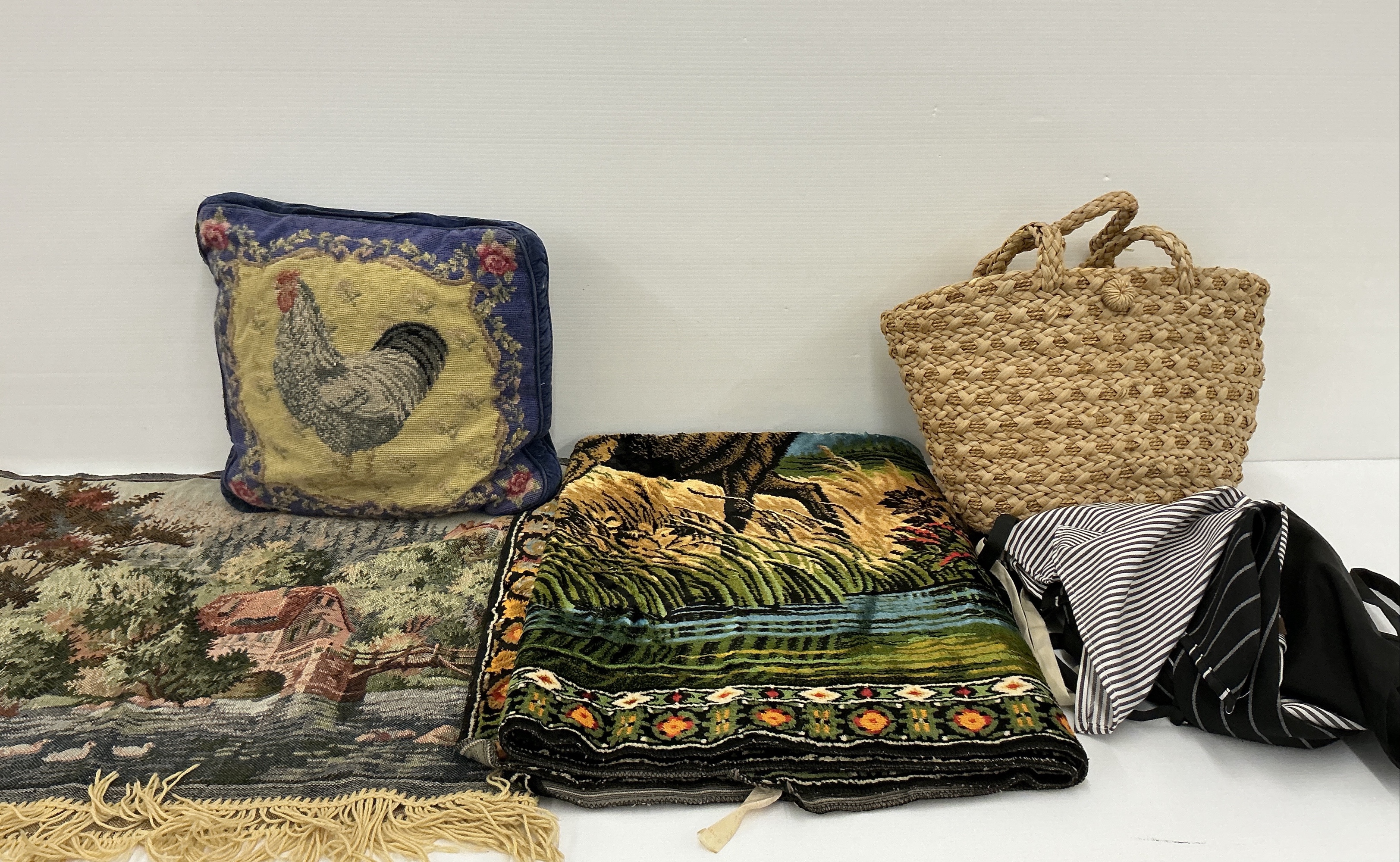 Mixed Lot: Aprons, Tapestries, Throw Pillows, and Straw Tote Bag