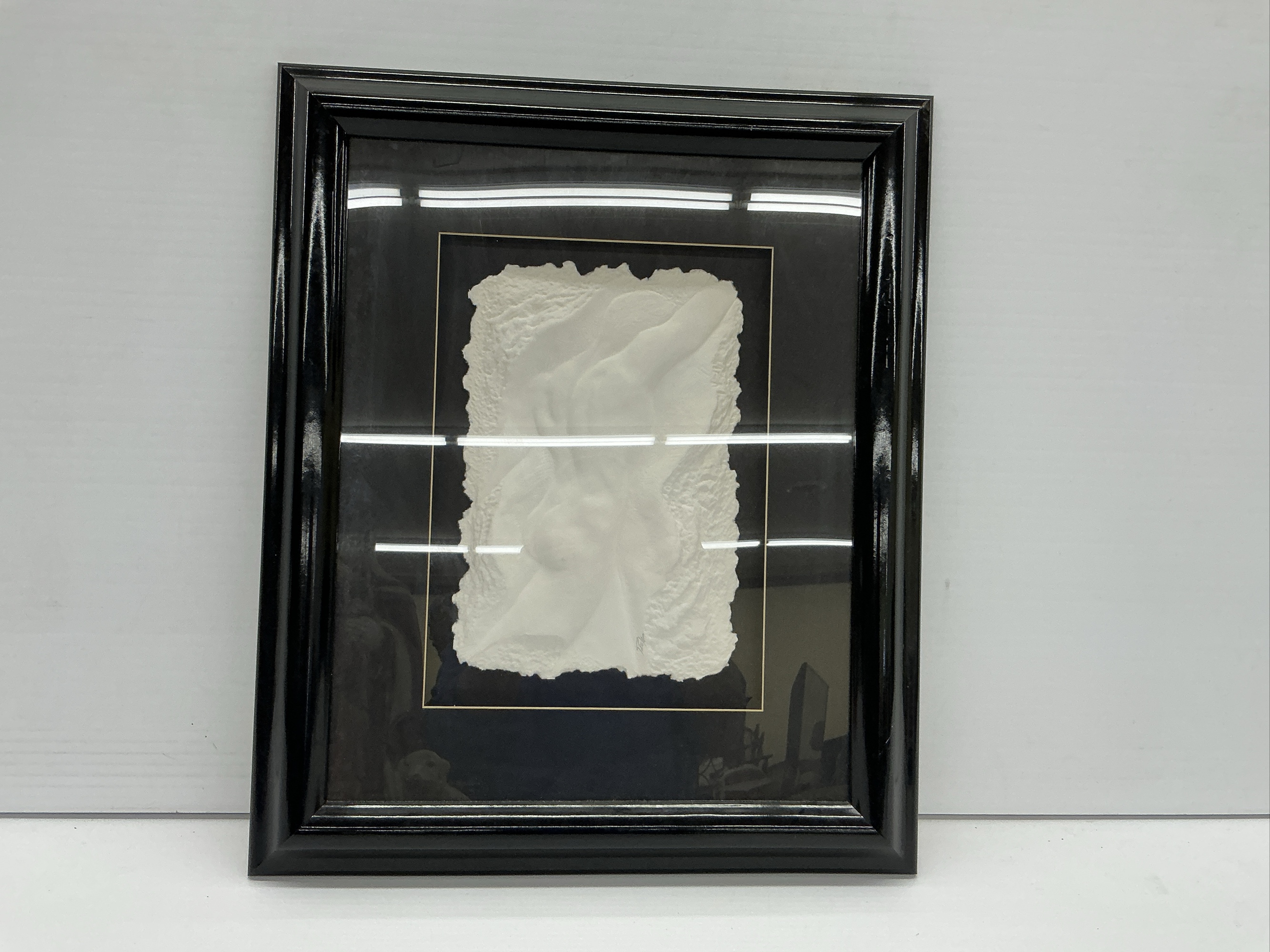 This is a framed bas-relief sculpture. The piece features a nude figure and is signed by the artist in the lower portion of the sculpture. The frame is glossy black and ready to hang. 24 x 20 in.