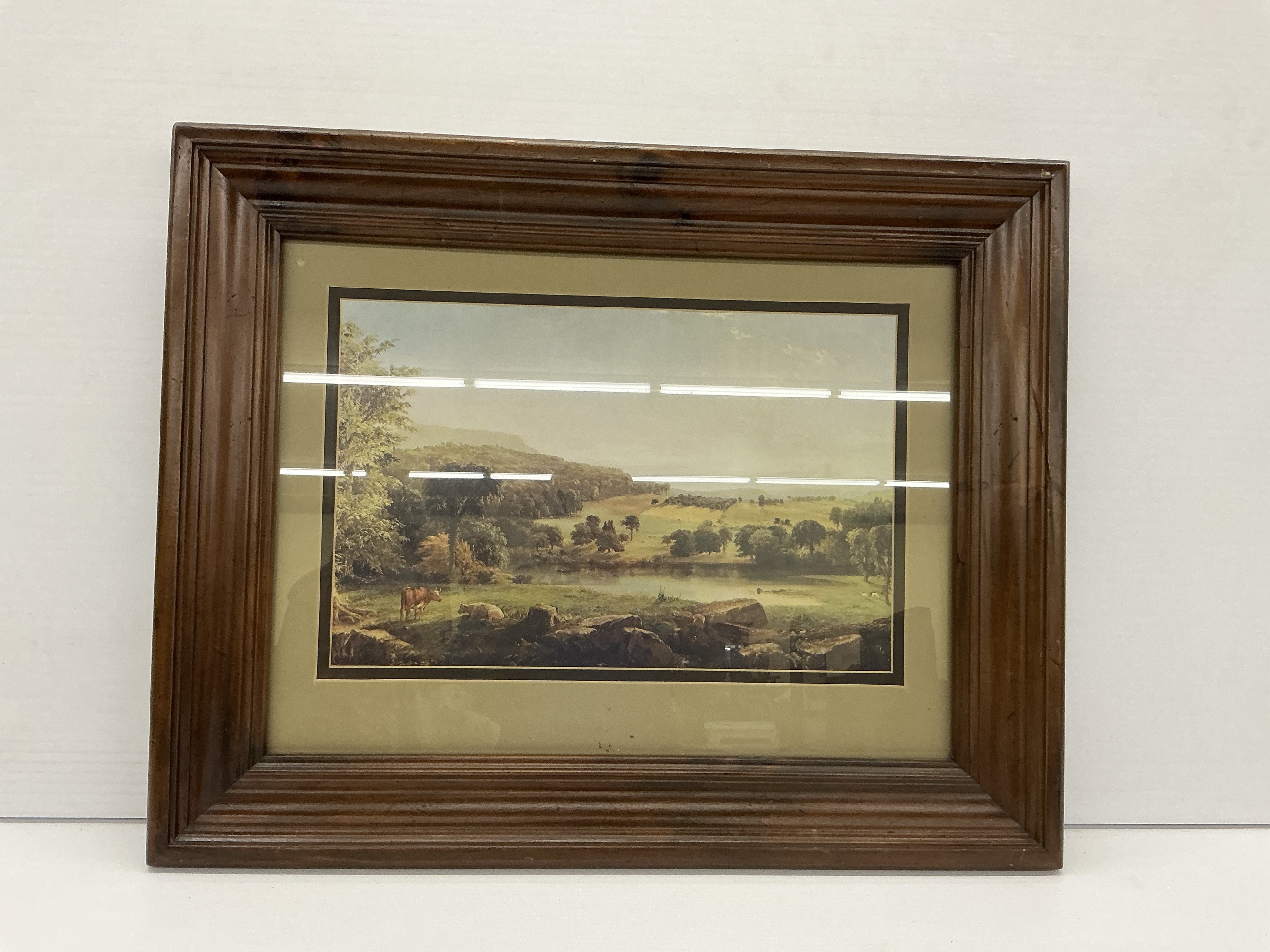 A framed print depicting a landscape with cows grazing near a body of water. The print is set within a dark wooden frame.