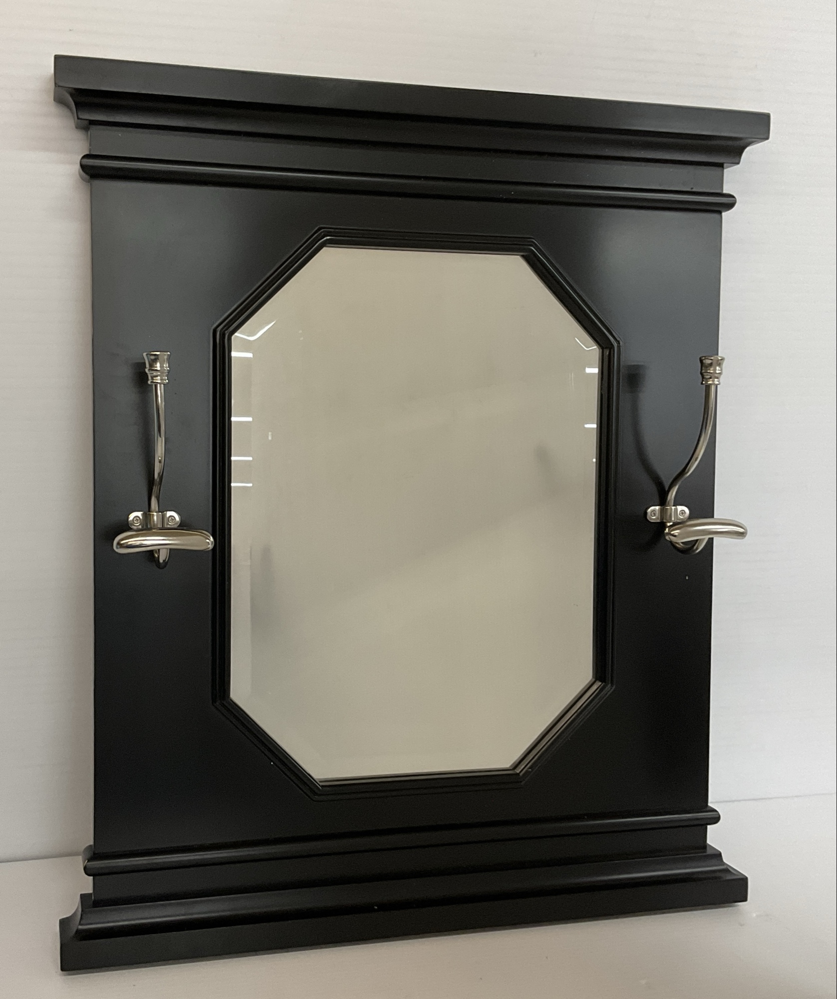 Wall-mountable mirror featuring a black frame, octagonal mirror, and two chrome coat hooks. 30.5 x 26 x 4 in.