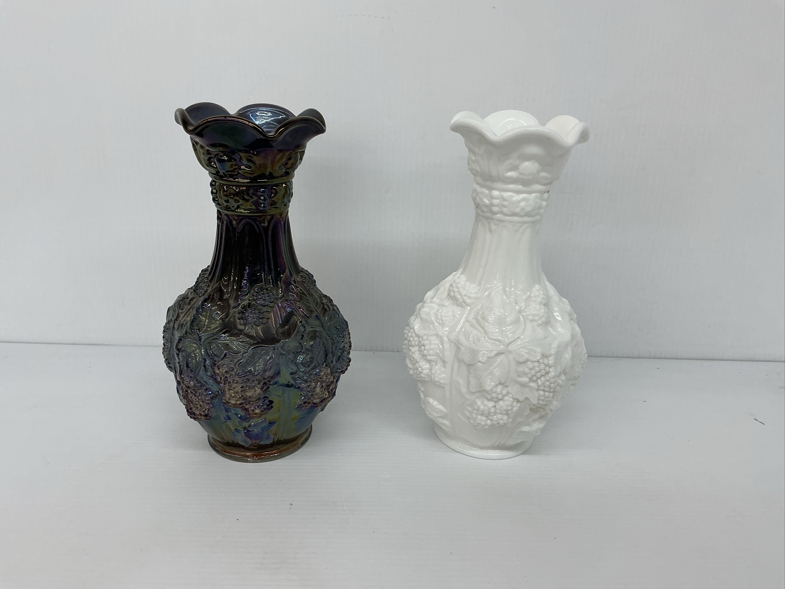This listing features a pair of 10 in. tall vases. Both glass vases have a grape and leaf design. One is white and the other iridescent.