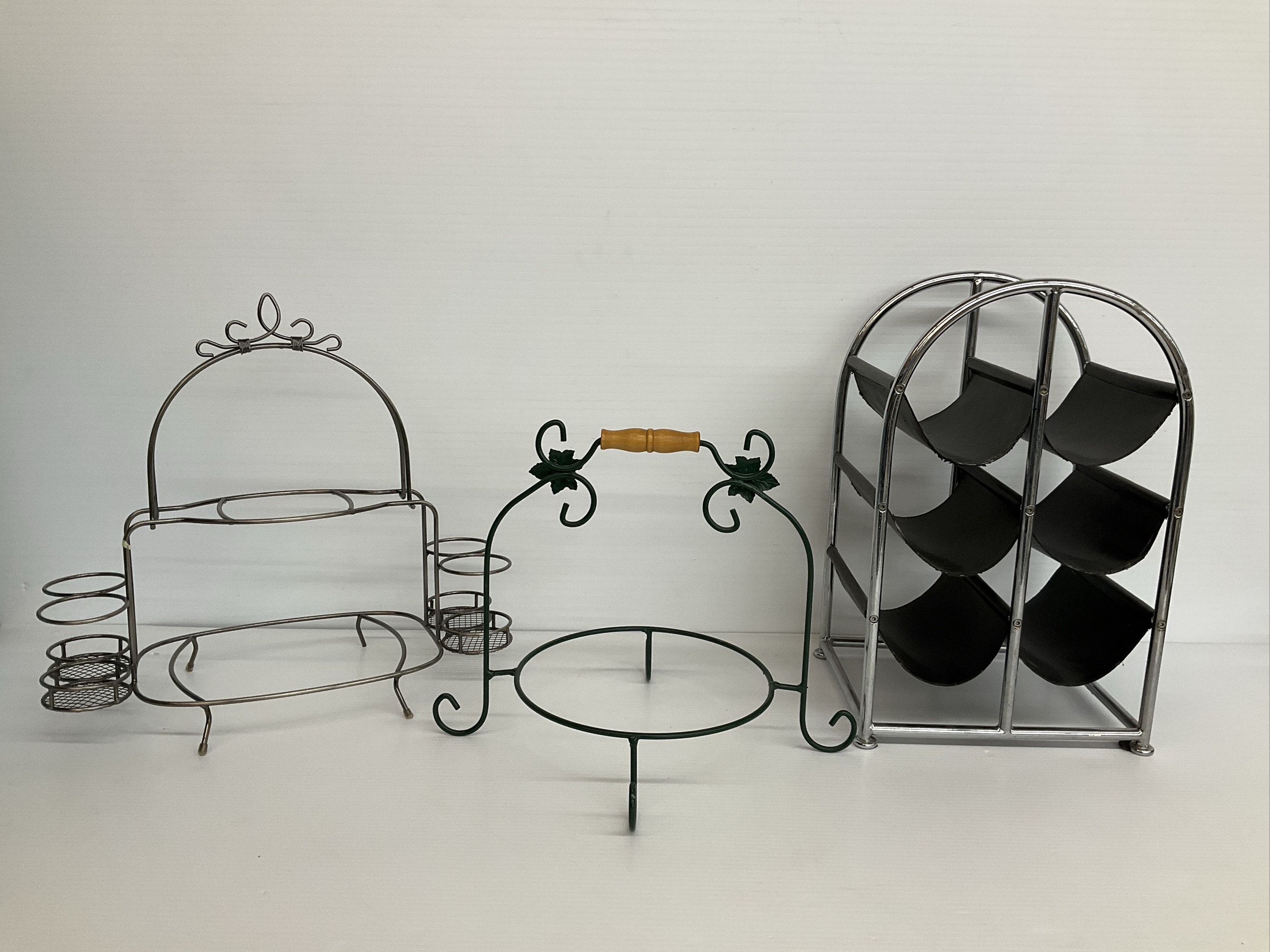 This lot features three decorative metal stands. One with a wooden handle and leaf design, one chrome magazine rack, and a larger stand with bottle-holding rings. Tallest is 17.5 x 11 x 9 in.