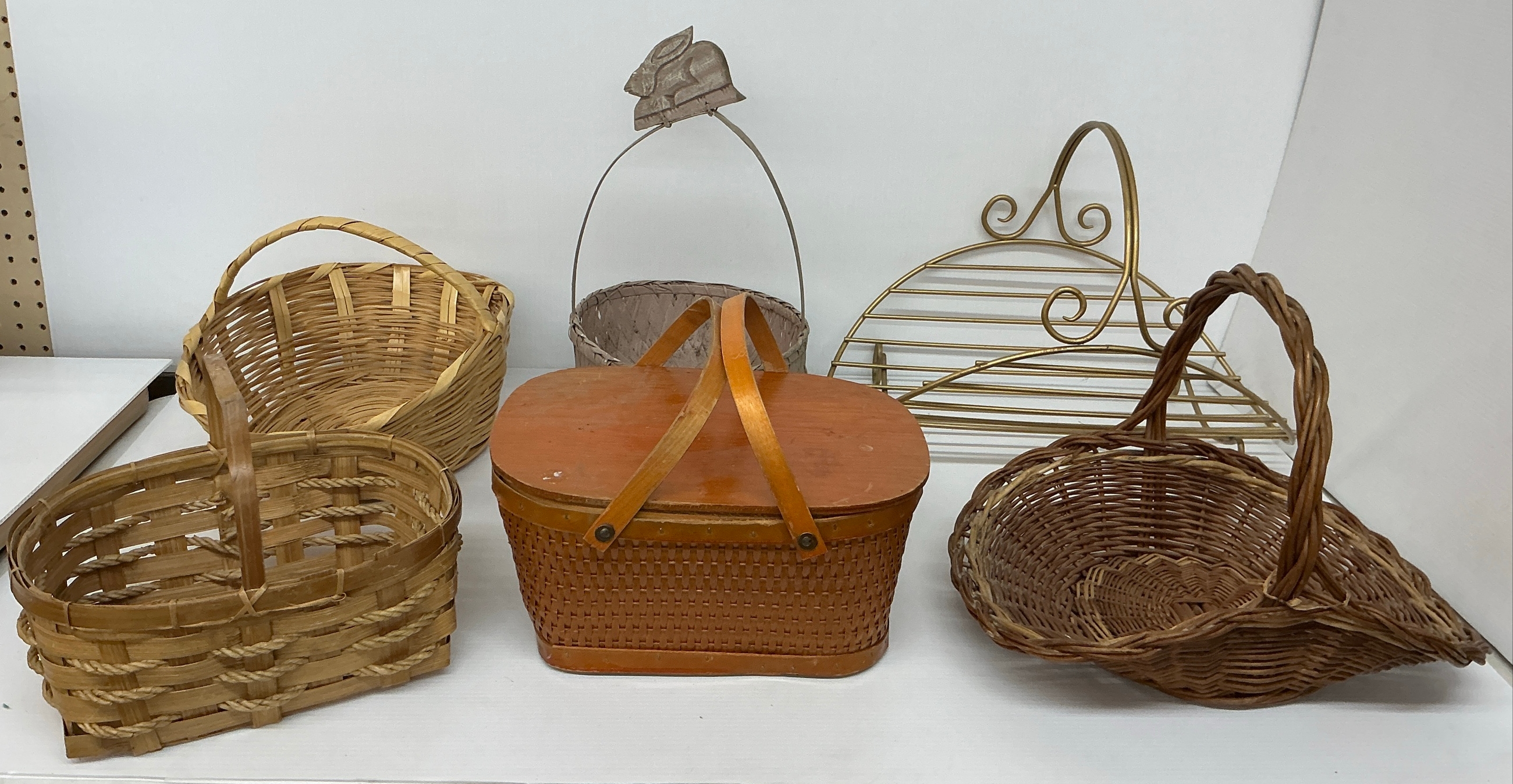 Selection of decorative baskets of different materials, including wicker, metal, and wood. One is a lidded rectangular basket marked with "C. Redmon, Peru, Indiana". The metal one measures 13 x 18 x 13 in.