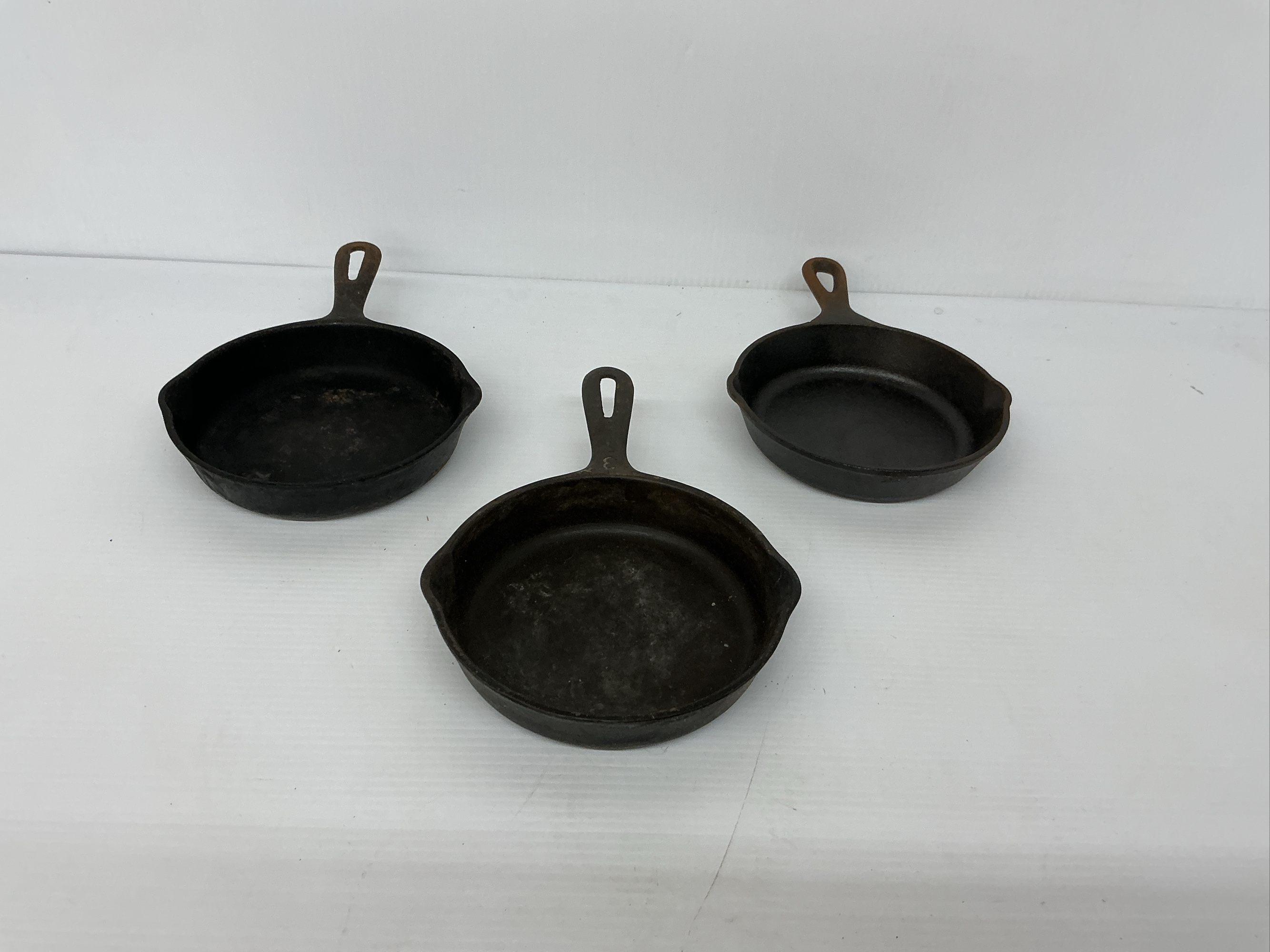 Set of three mini cast iron Lodge brand skillets. Each has a diameter of 6.5 in. Perfect for individual servings or crafting.