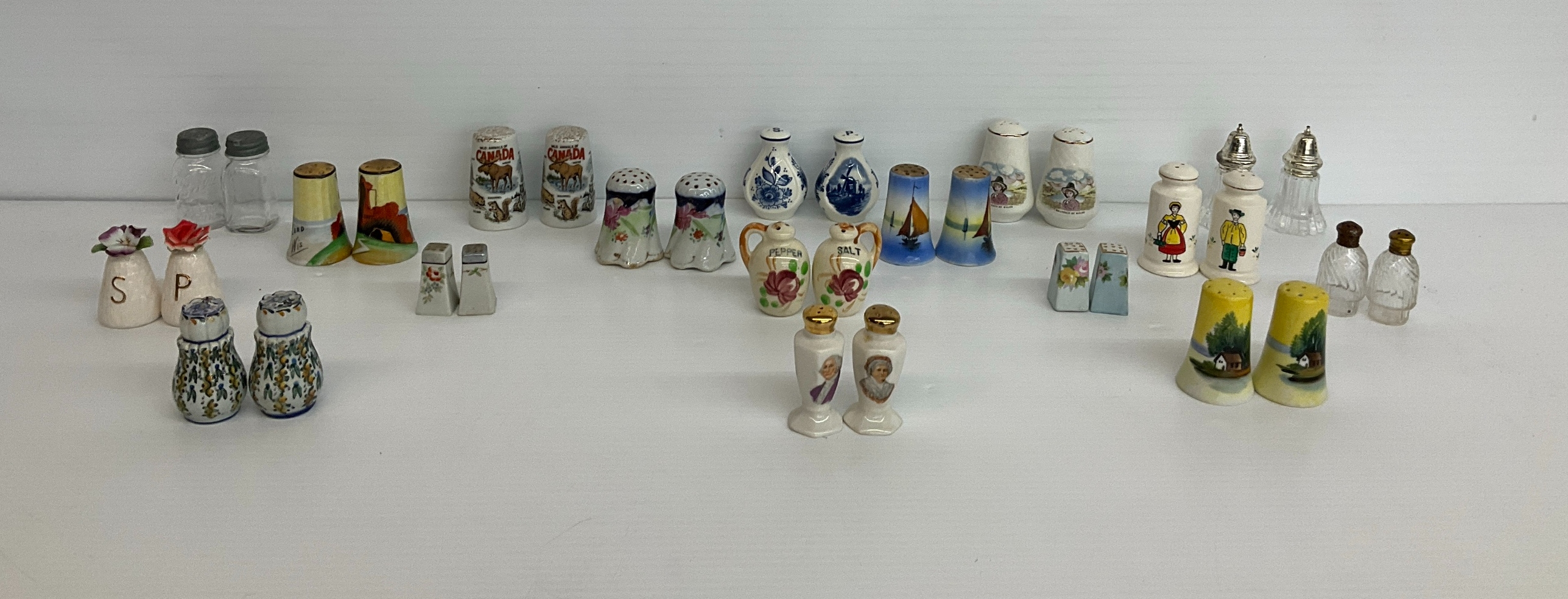 This collection features a variety of salt and pepper shakers, including souvenir shakers from Ashland, Wisconsin, and Canada; floral shakers; and shakers with other various designs.
