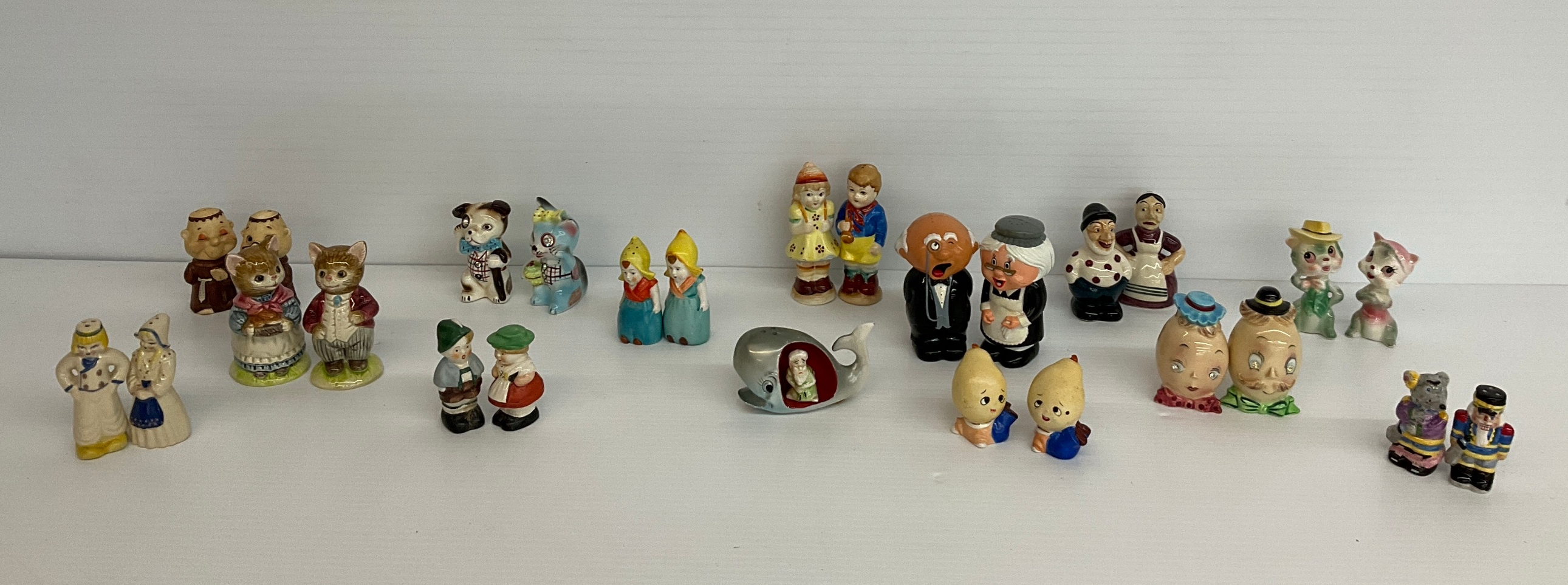 This group of ceramic salt and pepper shakers include figurines of people and animals. Some are marked 'Japan' and 'Goebel'