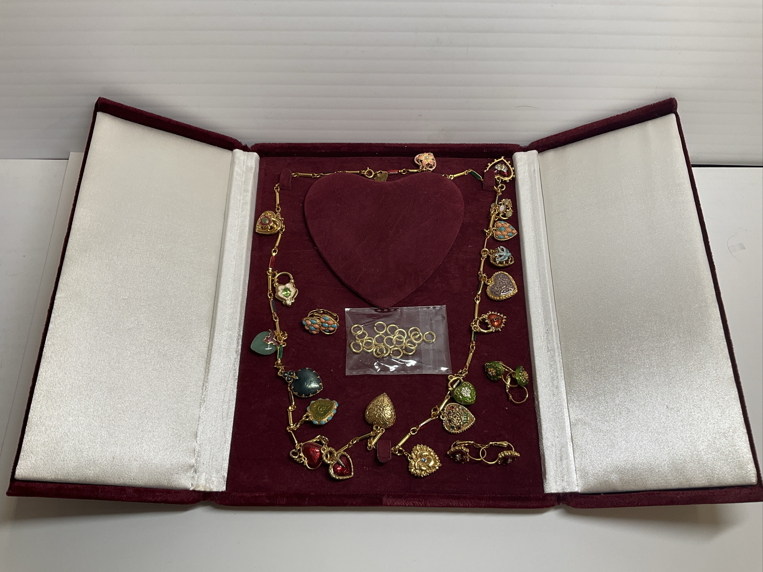 This lot includes a Joan Rivers gold-tone charm necklace featuring various heart-shaped and decorative charms. Also included are several earrings and a bag of extra links, all presented in a velvet-lined display case.