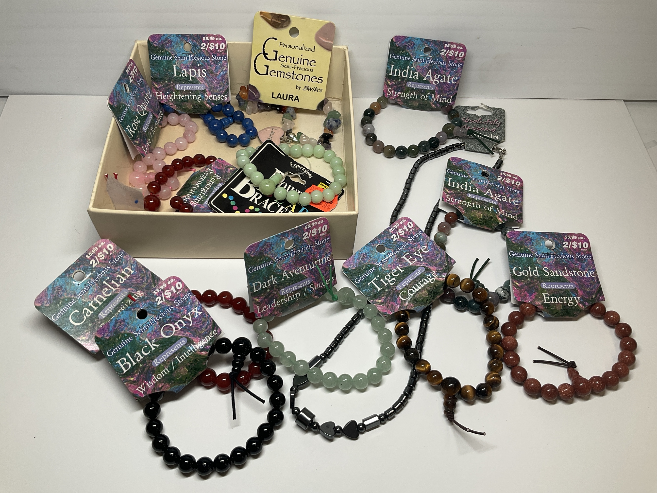 Assorted lot of gemstone bracelets including Lapis, India Agate, Rose Quartz, Carnelian, Black Onyx, Tiger Eye, Gold Sandstone, and others. Some bracelets have tags indicating the type of stone.