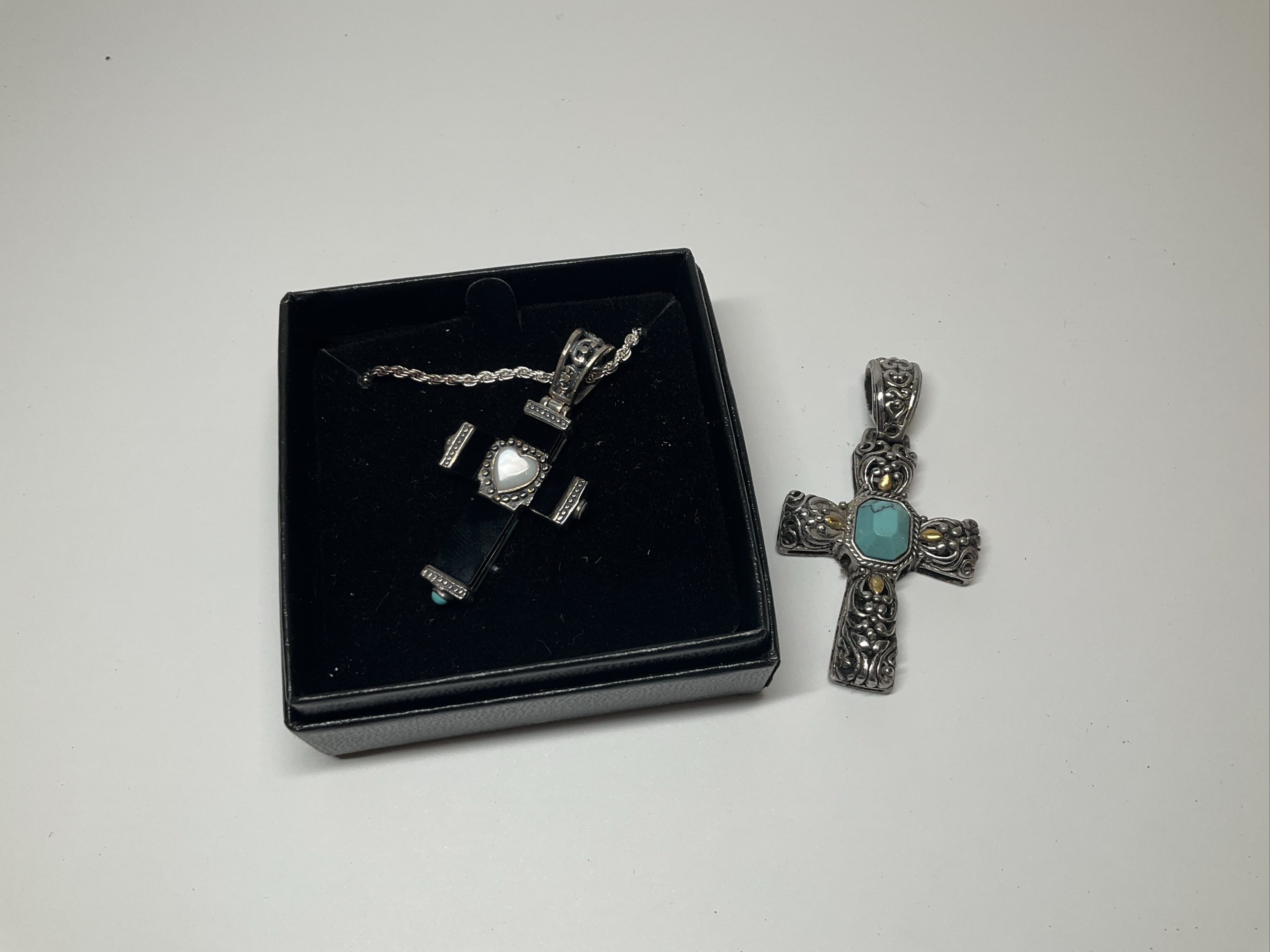 This lot features two double sided cross pendants. Pendants include turquoise and other stone accents.