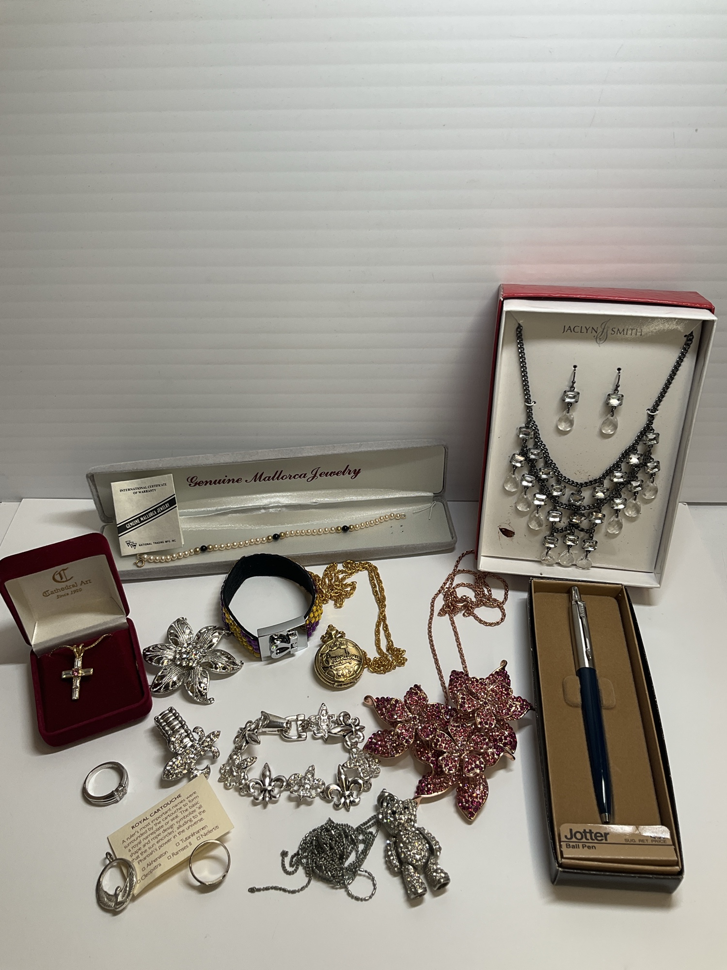 This diverse collection includes a variety of jewelry pieces such as necklaces, bracelets, brooches, and rings, featuring brands like Cathedral Art and Jaclyn Smith. Also included is a Jotter ballpoint pen and a Genuine Mallorca Jewelry piece. Rings are sizes 5 and 6.5. Some damage in this group.