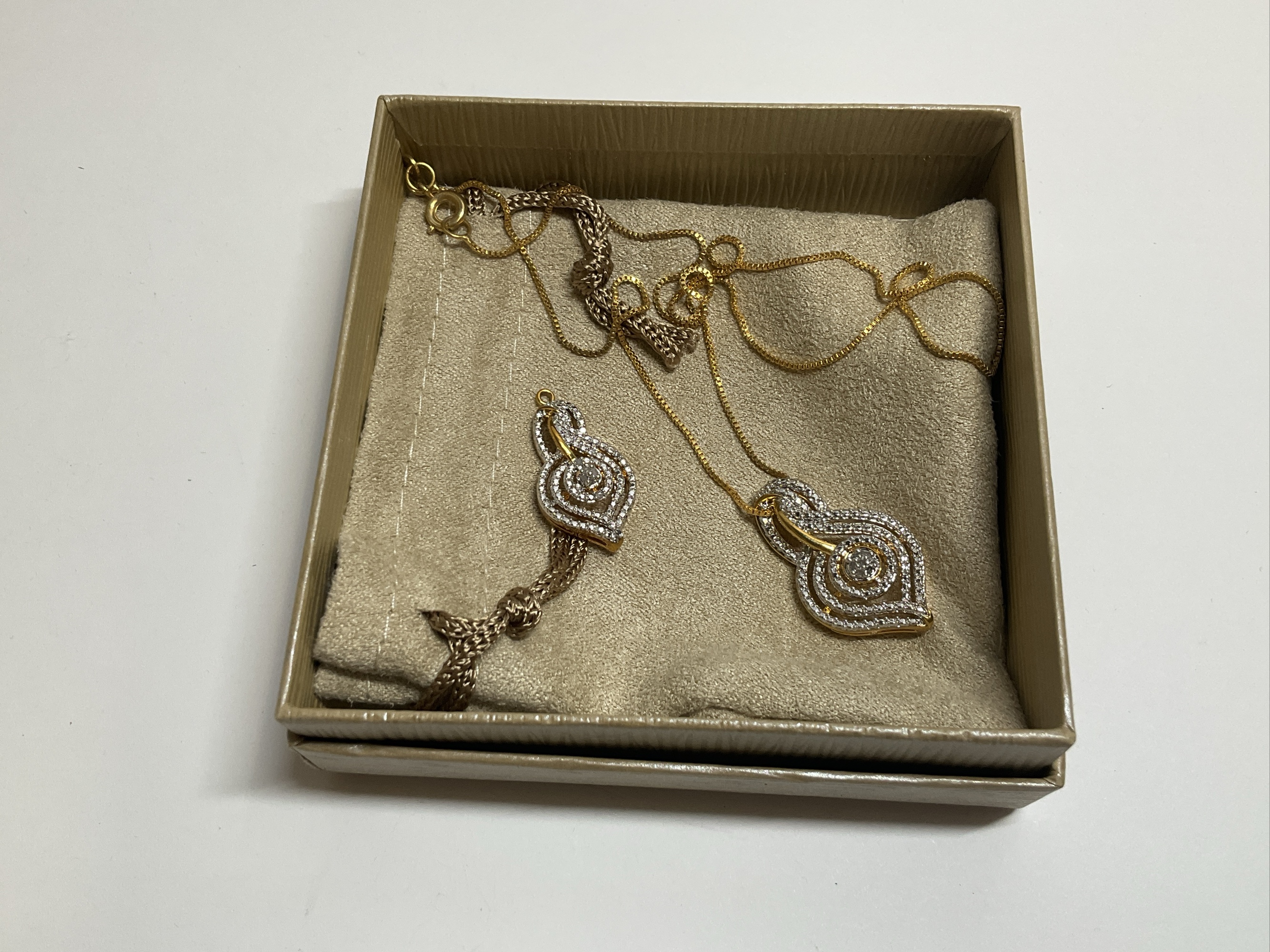 This lot features a pendant necklace and a chain with matching pendant. The necklace is a gold tone. The pendant and chain are presented in a display box.