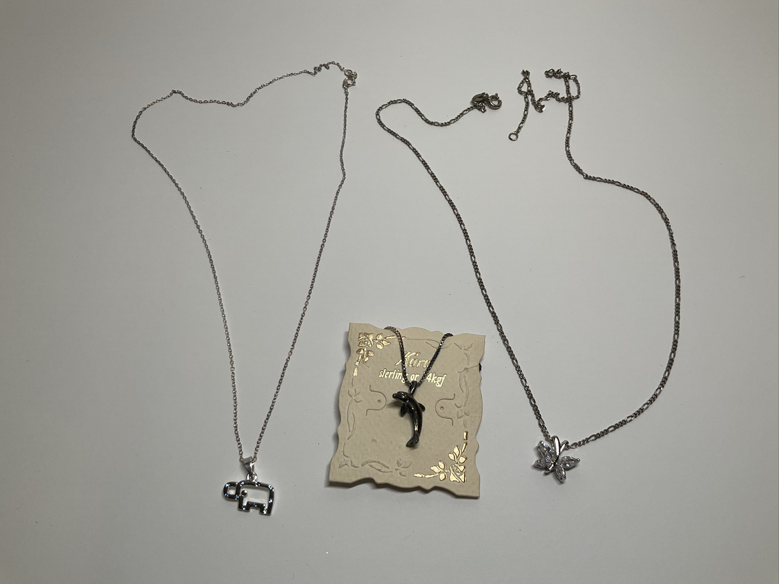 This lot includes three charming necklaces. One features an elephant pendant, another a dolphin, and the third a butterfly design.