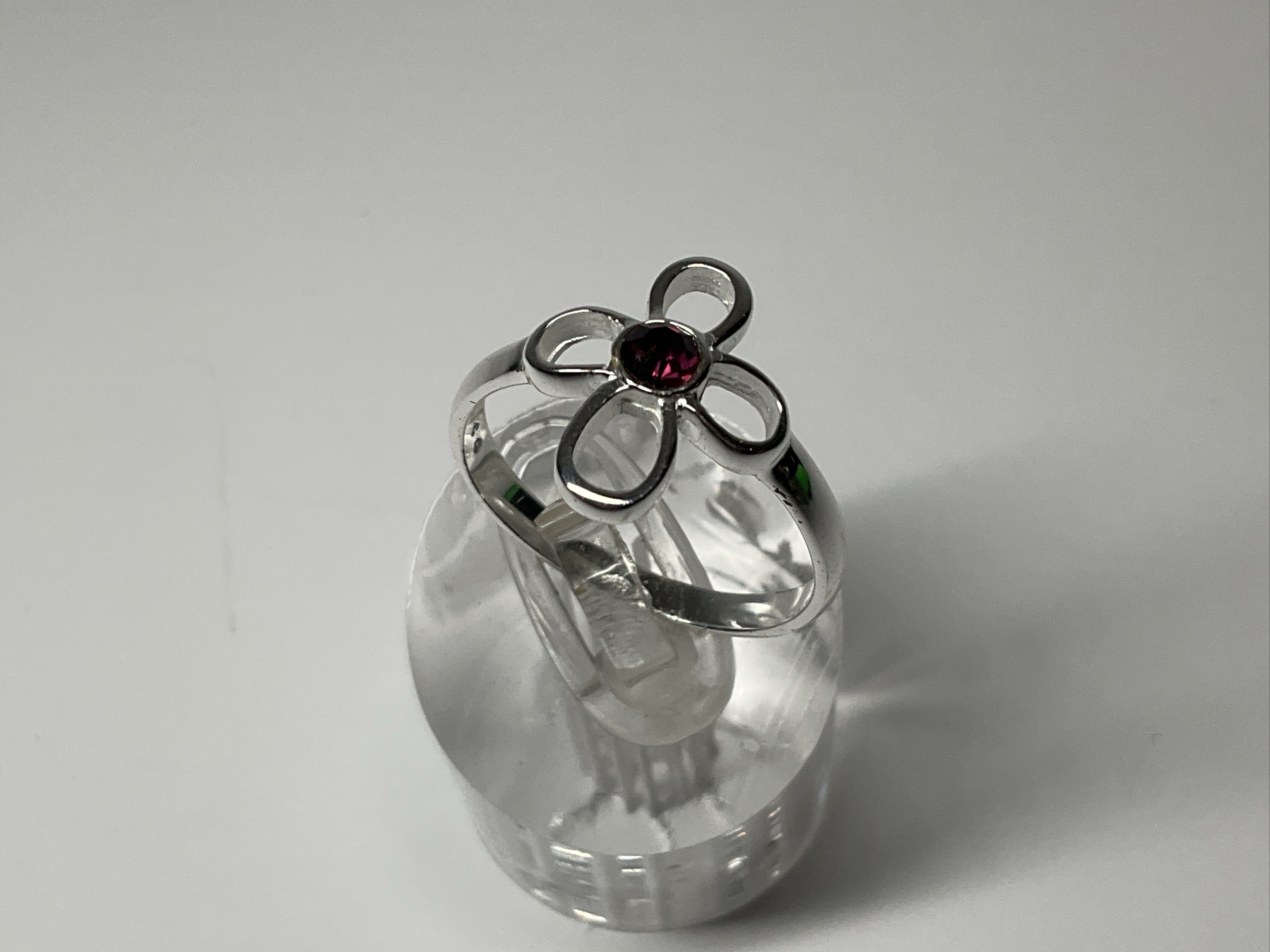 An impressive sterling silver ring featuring a flower design with a stone in the center.