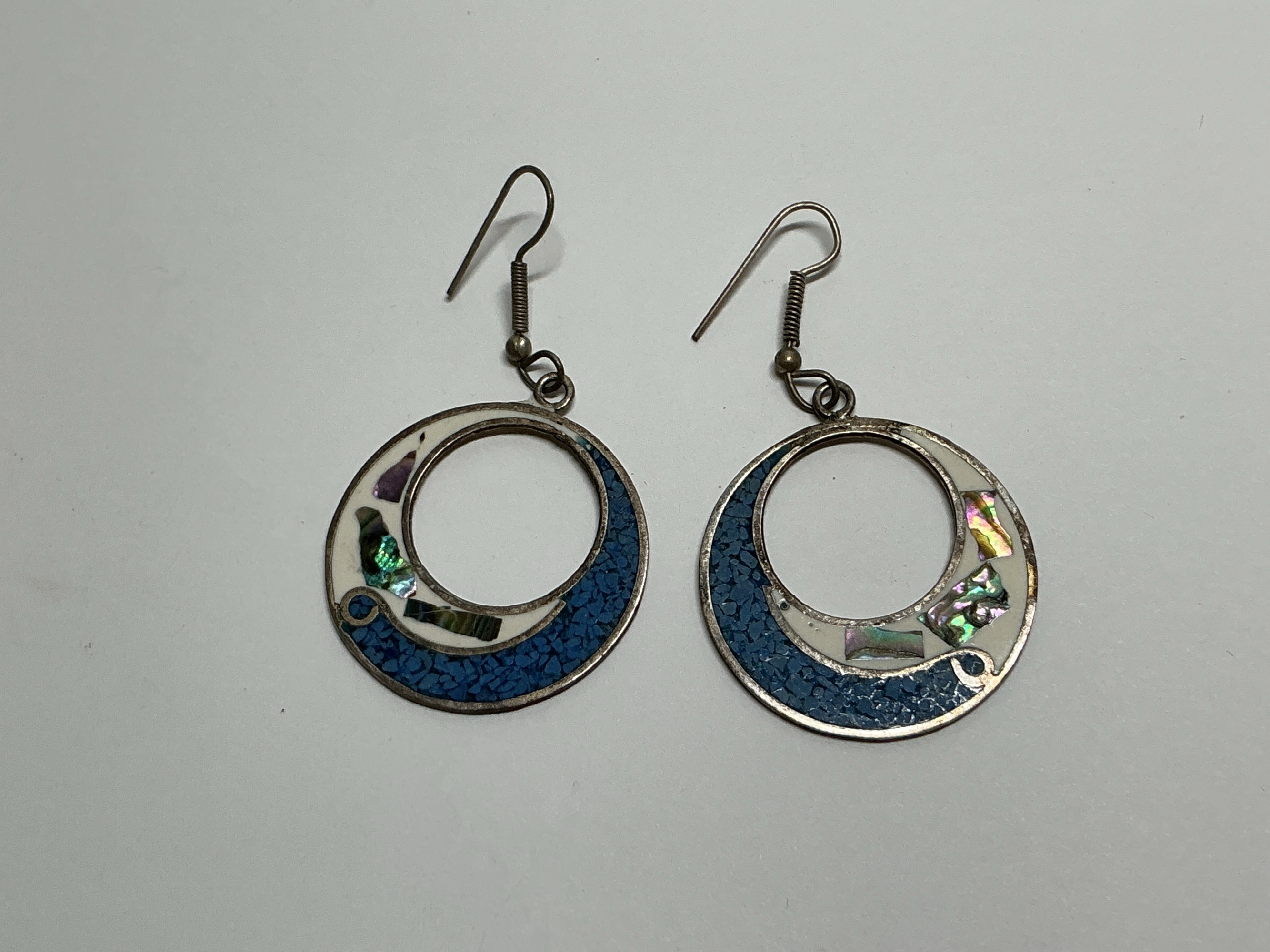 Pair of earrings crafted in Taxco, Mexico. They feature a design incorporating crushed turquoise and abalone shell details.