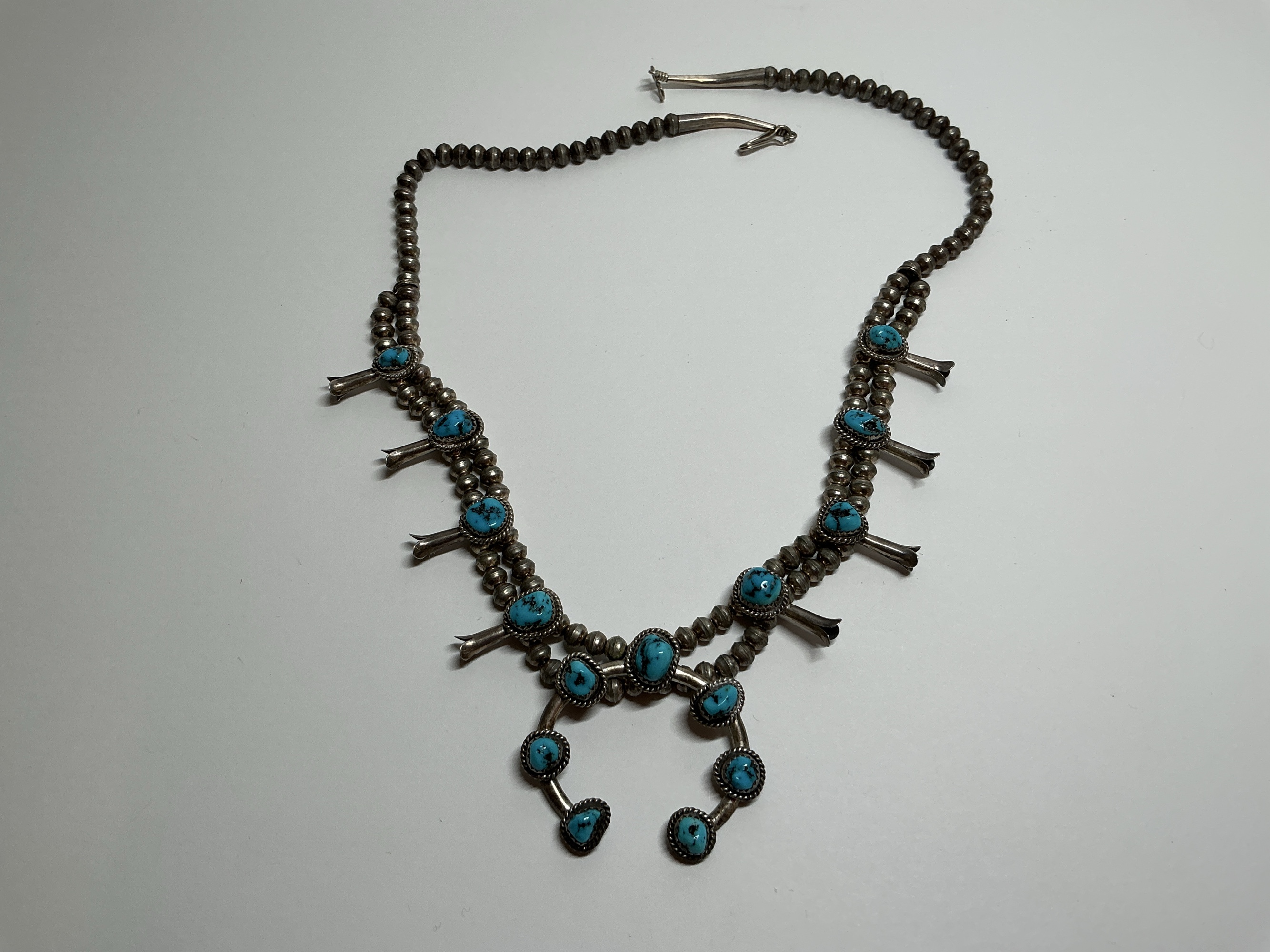 This is a handmade sterling silver necklace featuring a squash blossom design with turquoise stones. The necklace is strung with sterling silver beads.